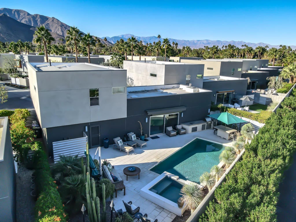 When only the best will do! Discover this luxurious, custom-built contemporary oasis within the exclusive enclave of The Morrison, a private collection of 53 homes located minutes from downtown Palm Springs. Enter through your exquisitely designed private courtyard, featuring dramatic San Jacinto Mountain views, a large fire pit, and a soothing water feature, setting a Zen-like tone. Inside, the open floor plan showcases a spacious great room with soaring 10ft ceilings, sleek tile flooring, two sets of Fleetwood sliding doors, and a custom-built fireplace and media wall. The chef's kitchen impresses with quartz countertops, Decor appliances, modern cabinetry, and a dramatic dining bar. A versatile third bedroom with a full bath on the main level provides comfort for guests or the perfect private office. Upstairs, the primary suite offers phenomenal western mountain views, built-in closet systems, and a spa-like bath complete with dual vanities, a soaking tub, and a double shower. A second bedroom with an En suite bathroom completes the top level. With over $250K in upgrades, this home features 28 owned solar panels, 3 Tesla Powerwalls, custom California cabinetry, a home entertainment system, and dual-zoned AC. The resort-style backyard boasts an Ionized pool and spa with waterfall features, an outdoor kitchen, and ample space for relaxation or entertaining. The Morrison offers privacy, convenience, low HOA fees, and you own the land. This Palm Springs home truly has it all.