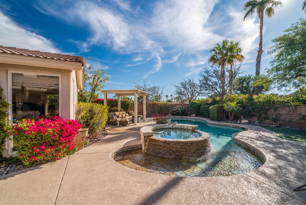 You just found the perfect combination of being inside a Country Club yet have the privacy of not being on the Golf Course, the Ventana section of Rancho La Quinta! This immaculate 3 bedroom, 3 baths home comes truly turnkey furnished, you won't have to wait for deliveries to move right in. The Great Room features lots of windows and double access to the back yard, a fireplace for the cool evenings, and a chef's kitchen with its huge island offers multiple dining options. The primary suite has direct access to the back yard and pool, large tub and separate shower stall, two sinks and 2 closets. The 2 guest rooms, both with private bath, are on the opposite side of the house for privacy. One of the guest rooms is currently set up as a Hobby Room for model railroad and will be changed back to a twin bedded room, it has lovely mountain views! The large backyard has a sparkling saltwater pool and spa, mature lemon, orange, mango and grapefruit trees, and backs up to a green belt, no direct neighbor to the south. Golf and Social Memberships are available, please inquire for details.