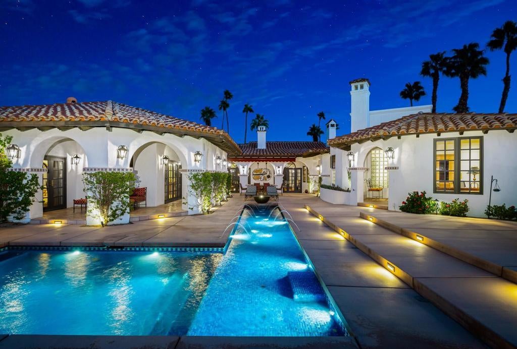 Casa Del Zorras | Custom built and in pristine condition, Spanish Old-World Design Gated Estate situated Lakeside in the Desert Falls Estates community of Palm Desert. Entering this home, instinctively you begin to feel the warmth, styling and Old-World Spanish Charm along with modern amenities. Plaster walls and arches, handmade French glass doors and windows, Saltillo paver floors, soaring high exposed beam ceilings, four fireplaces, multiple covered patios, pool, spa, lake and mountain views. This wonderful home offers incredible indoor outdoor desert lifestyle living. Living room, Dining room and wet bar share a see thru fireplace along with direct pool-patio access and direct Lake and Mountain Views. Great room kitchen offers top-of-the-line SS appliances, breakfast bar, informal dining, media and a cozy Fireplace. Dine alfresco... direct patio access and outdoor kitchen are just a few steps away. Off on its own, a luxurious and spacious primary suite, with fireplace and exposed beam ceiling, dual closets and toilets, plus cedar lined Sauna and Gym-Bonus space, all with direct pool-spa, patio and putting green access. Soak in your bathtub fireside in this luxurious spa bath. Office-4th suite offers flexible living spaces. Opposite side, there are two spacious lake view guest suites. There is also a bonus room perfect for home GYM. Furnishings Negotiable. BONUS - Owned Solar +3 Tesla Batteries Power this 5172-SF home, keeping energy costs below $400.00 Annually