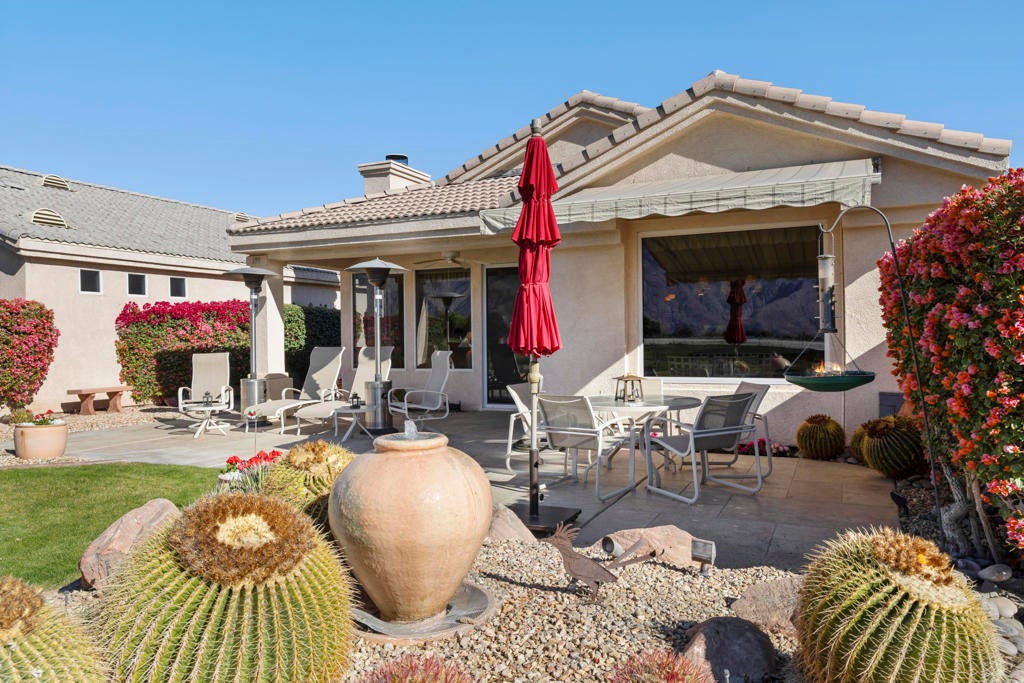 YOU OWN THE LAND on this TURNKEY FURNISHED home! PREMIUM VIEW LOT - 2-beds-plus office-w/Murphy beds. Five minutes by golf cart to the course, fitness, spa, tennis, pickleball, bocce ball, club dining room; 5 minute walk to swimming pools; 10 minute drive to downtown Palm Springs & airport. Very quiet. Wall to wall energy efficient windows with custom coverings; Exceptional vistas of the golf course and San Jacinto mountains; Stunning sunsets; Birds - herons, hummingbirds, cardinals, doves, owls; Open plan with 9 foot and cathedral ceilings; Versatile design layout - great for entertaining, great for daily living; Huge private patio, all day sun, southern, western exposures; Beautiful desert scape landscaping with water features and LED lighting; Exterior stone clad trim; Upgraded kitchen - lighting, countertops, cabinets; Gas fireplace; High quality built-in cabinetry - master bedroom, dining room, laundry room; Laundry room with sink; Water softener; Murphy beds in bonus Den/Guest Rm; Motorized awning over Dining Rm window; Original art; Italian imported dishes, urns, serving platters; Ultra-high end custom built furniture; Three Flat panel TV's; Garage Includes custom built storage units; workbench, men's and women's Trek bicycles. The Desert Princess has an affordable 27-hole PGA rated Champion golf course, highly rated by GOLF DIGEST; Tennis, Pickleball; great restaurant = all included in HOA.