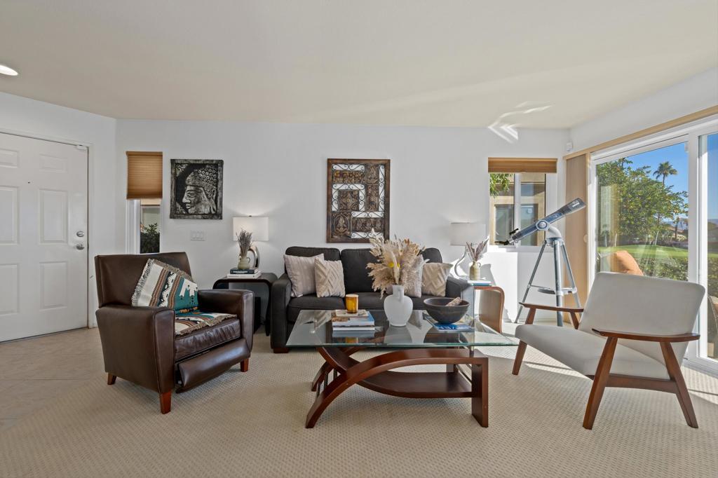 This beautiful end unit condo with no unit above is surrounded by scenic greenery. Enjoy picturesque views of the lake, fairway, and mountains right from your patio. The open living area seamlessly connects the kitchen, dining, and living room, making it perfect for easy living and entertaining. The bedrooms feature vaulted ceilings, and custom blinds and shutters add a touch of style and privacy to the windows. This single-level unit ensures peace and quiet with no one living above you. The interior is decorated in warm neutral colors, creating a cozy and inviting atmosphere. Both baths are updated. Essentials like WiFi are included, and you'll have access to a community pool and spa just steps away. There's a 1-car garage and plenty of parking for guests or larger vehicles. Within the gated community, you'll find a Par 3 walking golf course and a clubhouse with a workout area. The condo is conveniently located across from the Indian Wells Tennis Gardens, home of the BNP Tennis Tournament, and is close to 5 PGA West resort golf courses, La Quinta Resort, Old Town La Quinta, surrounding shopping, restaurants, and the 10 freeway. Come see this lovely condo and make it your new home!