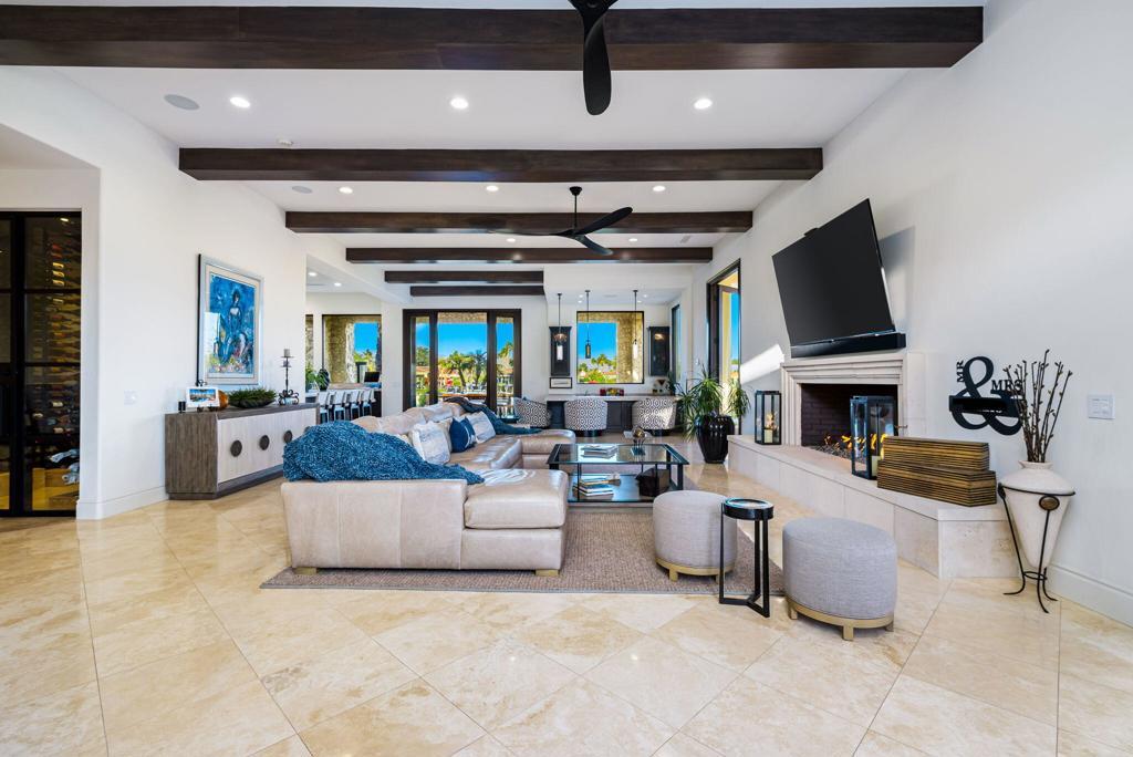 PRESTIGIOUS GATED COMMUNITY/OPEN FLOOR PLAN! COMPLETE RENOVATION/BREATHTAKING VIEWS! Located behind the exclusive gates of 'Peninsula Park' in PGA West! This custom home had a complete renovation in 2022 & is impeccable. Overlooking the 2nd fairway of the beautiful Tom Weiskopf course, you will enjoy mountain, lake & fairway views. The open floor plan of this magnificent home begins w/a custom pivot door entry into the great room w/12' beamed ceilings & 10' doors for an abundance of natural light. The culinary kitchen awaits the opportunity to entertain w/quartzite counter tops, Wolf, Sub Zero & Miele appliances &custom cabinetry. When entertaining in the formal dining room, prepare to impress your guests w/an 800 bottle wine cellar. The large primary suite is a luxurious retreat w/sitting area, fireplace, soaking tub, walk in shower, 2 vanities, 2 water closets & large walk in closet! There are 2 additional guest rooms in the main house w/ en-suites! Guests will find ultimate comfort in the spacious detached two-room casita, complete w/ a living area, well appointed office, kitchen bar, bedroom, bathroom & direct access to the pool! The wrap around backyard is seamless to the home supporting a 2nd 'outdoor dining experience', large pebble pool & spa w/flowing waterfall, outdoor kitchen,& fire pit. There is a large 3 car garage. The home comes fully furnished w/the newest decor of Restoration Hardware & Bernhardt & includes a BMW golf cart making it move in ready!