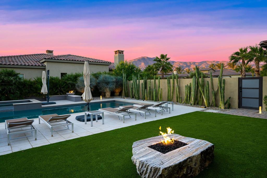 Unique opportunity to own one of the largest lots with stunning mountain views! Located inside the Greg Norman Gate at PGA West in La Quinta, Monterra is a private oasis just a short golf cart ride away from 6 golf courses and 3 clubhouses. Enjoy this premium lot with a magnificent pool and vibrant landscaping. This highly upgraded Residence 1 Floor Plan boasts 3,180 SqFt, 4 en-suite bedrooms, 4.5 baths all located on a huge 14,810 SqFt private lot. The gourmet kitchen is a chef's dream with granite counters, waterfall edges, Wolf appliances, Sub-Zero refrigerators and drawers, upgraded cabinetry and backsplash, and a walk in pantry. The elegant great room features surround sound Dolby Atmos 13 speakers, custom floor to ceiling fireplace, and pocket sliding doors opening to an outside covered Loggia with fireplace. Enjoy the exquisitely designed landscaping, highly upgraded swimming pool and spa, four fire pits including one made from natural desert stone, upgraded decking, outdoor kitchen, exotic mature fruit trees, and mountain views to the South and West. The home has custom interior paint, custom electric blinds, upgraded flooring, and is controlled by a smart home system. Each bedroom has an ensuite bathroom with upgraded countertops and tile showers. The primary bedroom has French doors leading out to your private patio, a large soaking tub, and custom California closets. Sold furnished per written inventory.