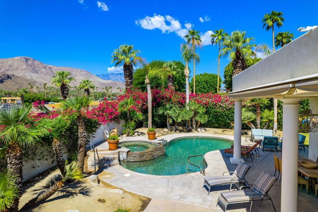 Mountain Views with Mediterranean Charm! South-facing on expansive corner lot in guard-gated community of Thunderbird Terrace, in the heart of Rancho Mirage. This 4bd/3.5 private pool home offers privacy and unobstructed mountain views. Offered turnkey furnished with custom finishes throughout. Recent upgrades include new - HVAC system, water heaters, Water Cop system, and more! Patio features new electric awnings, new gas fireplace, saltwater pool w/raised spa & large covered patio w/wood beams. Outdoor kitchen has bar counter seating with built-in BBQ, new pizza oven, sink & refrigerator - great for entertaining! Stunning entry iron & glass double doors lead to the spacious great room highlighted by wood beam ceilings, French doors, builtins & limestone fireplace. Kitchen features custom cabinetry, antique sink, slab granite counter tops & high-end appliances. New custom builtin bar area with wine & beverage refrigerators. Spacious primary suite includes sitting area and fireplace...French doors for private access to the pool/patio. Primary bath designed w/custom vanities, large shower & separate tub, and large walkin closet with built-ins. Guest suite with Murphy bed has private access to side yard with lush landscaping & mature fruit trees. Attached Casita provides a kitchenette, living room, separate bedroom & ensuite bathroom and direct access to side yard/pool area. The 4th bedroom is set up as an office/den with custom builtins. Attached 3-car garage with workroom.