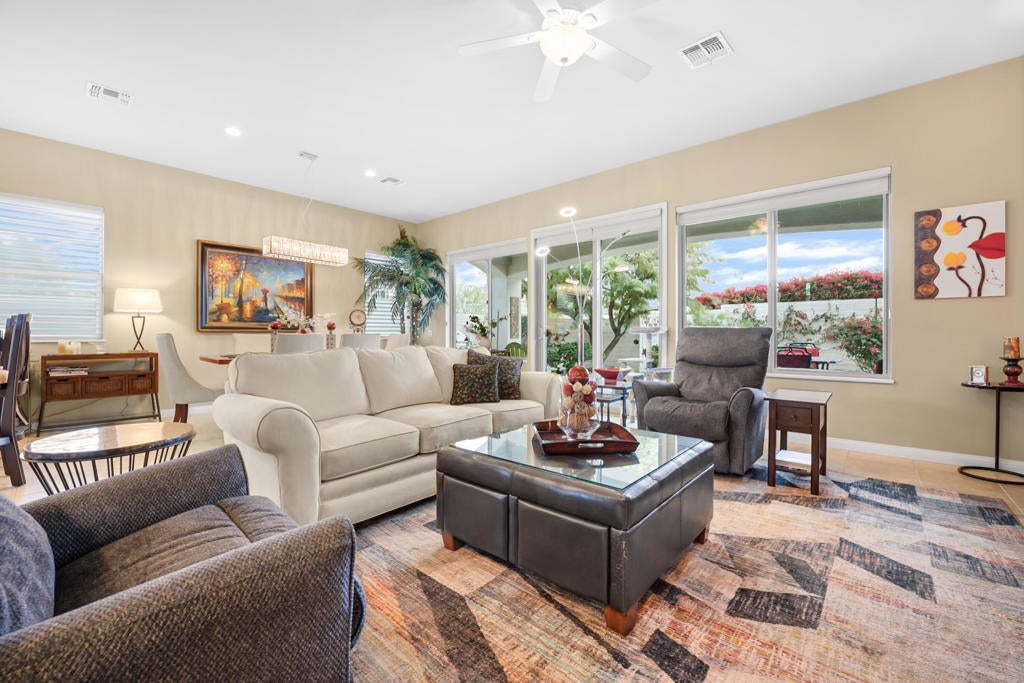 This beautifully upgraded San Benito model home in Sun City Shadow Hills boasts 2 bedrooms, 2 bathrooms, plus a den and a bonus room for even more possibilities. Features include tile flooring throughout, with wood-grain tile in the den and bedrooms, creating warmth and character. The remodeled kitchen showcases sleek cabinetry, modern stainless steel appliances, and a breakfast bar perfect for casual meals. The primary suite offers a walk-in closet and an en-suite bathroom with dual sinks, a soaker tub, and a walk-in shower. The second bedroom and bathroom provide privacy for guests. Outside, enjoy a large corner lot with a fire pit and a spacious backyard patio for relaxation or entertaining. Additional upgrades include a new water heater, heating system, and air conditioner (November 2021), as well as a garage door opener replaced in December 2021. The 2 car garage plus golf cart garage features epoxy flooring for easy maintenance. Residents of Sun City Shadow Hills have access to golf courses, tennis courts, pools, and a vibrant social community. This move-in-ready home blends comfort and style for an active, relaxed lifestyle. Schedule your private showing today!
