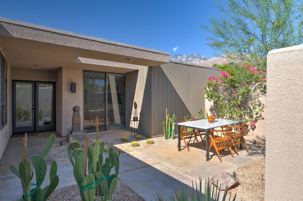 Tucked away in one of the most desirable and sought-after enclaves in the Twin Palms community of south PS, this captivating 2 BDR-2BA single level residence was designed by renowned mid-century architect Laszlo Sandor. It has been reimagined with an exceptional renovation, showcasing sophisticated finishes that complement the desert environment and life-stye. Privileged by its unique location within the community, this home benefits from a larger greenbelt along the side patio, enhancing its exclusivity and serene ambiance. The living room features a cozy fireplace and soaring ceilings, seamlessly connecting to the SW facing patio with stunning mountain views. By capturing the gentle morning natural light in your private front courtyard or the vibrant afternoons sheltered by the mature olive tree, this property assures great outdoor space to simply relax or enjoy al fresco dining. Boasting an open concept and functional layout, the upgrades include new custom cabinetry and countertops throughout, beautiful flooring, remodeled bathrooms and manicured landscaping. Primary bath redesigned to allow a modern large shower, private water-closet & stand-alone tub. This eco-friendly home incorporates leased solar system and EV charger. 2-Car garage with storage and adjacent guest parking. Park-like common areas with community pools, spa, and sport courts (pickle ball and tennis). EXTENDED LONG TERM LAND LEASE through 2079.