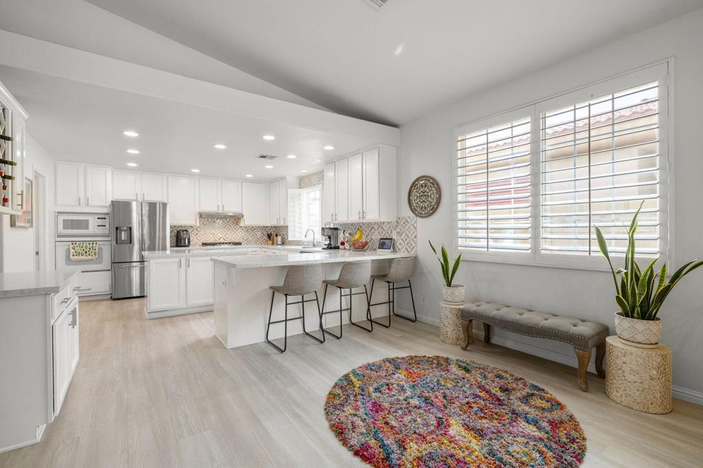 Welcome to this beautifully updated 4-bedroom, 3-bath home in the heart of North La Quinta, just blocks from top-rated schools, shopping, and parks. The open floor plan features high ceilings, creating a light and airy feel throughout. The renovated kitchen includes quartz countertops, modern appliances, a stylish backsplash, new flooring, recessed lighting, and a wine bar, perfect for entertaining.The cozy fireplace serves as the centerpiece of the living area, with sliding doors leading to a covered patio--ideal for staying cool during summer months. The main bedroom offers private access to the backyard and features a double-sided fireplace, oversized soaking tub, double vanities, separate shower, and a spacious walk-in closet.Additional guest rooms are generously sized, with one en-suite for visitors. The low-maintenance backyard features newer turf and a relaxing spa, ideal for children and summer fun.With newer AC units and an energy-efficient solar lease at just $193/month, this home combines comfort with savings. Low HOA fee of $93/month.