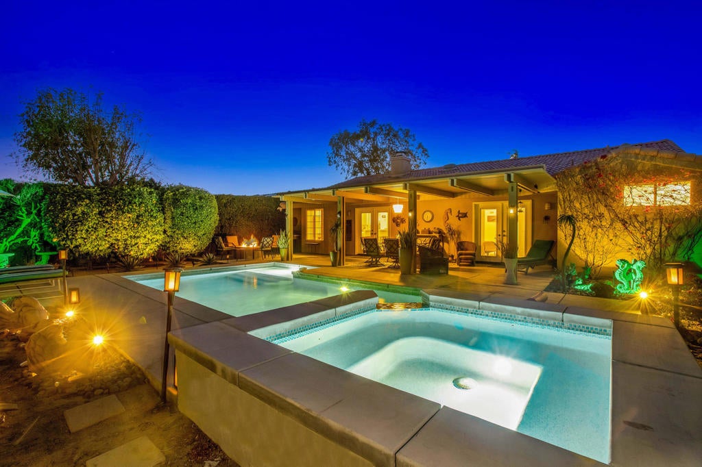 Your showplace awaits. Curb appeal sets the tone--desert landscape accented by mature Paloverde trees. All freshly painted interior with spacious layout perfect for gathering & entertaining. Vaulted ceilings. Unique dual sided/see-through fireplace divides great room from dining area. Generous kitchen boasts plentiful counter & cabinetry space, stainless appliances & breakfast bar. French doors (from both living area & primary suite) open to picture-perfect backyard paradise! Lush hedges & citrus frame an ideal resort-style saltwater pool with tanning shelf & elevated spa + waterfall spillover. Covered alumawood-style patio cover provides shade along entire back of home. PLUS, delightful fire-pit entertaining area. Block walls provide privacy & security as well as showcase mountain views above & beyond! Popular neighborhood known as Upper Outpost, non-gated, no HOA dues. FOUR bedrooms, 2 bath home. Primary suite with soaking tub & separate shower. Tile flooring throughout, carpet in bedrooms & living room. 2-Car attached garage; laundry room inside home with storage cabinets. Minutes from downtown Palm Springs, hiking trails, casinos, shopping, dining, freeway close + easy airport access! Enjoy gorgeous interior, lounge poolside, entertain, stargaze--this is the IDEAL remodeled property to call HOME. STOP searching and START living!