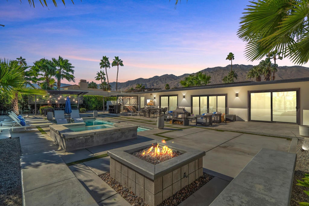 Welcome to your private retreat in the heart of Sunrise Park, Palm Springs. This fully enclosed corner-lot compound showcases stunning mountain views, motorized gate and a backyard tailored for seamless outdoor living. Dive into a sparkling pool, unwind in the cascading spa, or gather around the fire pit. The outdoor space also features a covered dining area and a TV entertainment zone, perfect for hosting or relaxing. An OWNED solar system enhances the property's value with significant energy savings. Inside, this home exudes style and sophistication, having been tastefully renovated throughout. Enjoy dual-paned windows with motorized window treatments, sleek tile flooring, and plush, lifetime-warranty carpeting in the bedrooms. The chef's kitchen is a standout with timeless cabinetry, quartz countertops, and high-end appliances, including a Wolf 5-burner gas cook top, double oven/microwave and a SubZero refrigerator/freezer. Both bathrooms have been elegantly updated with durable, stylish finishes. The open-concept living and dining areas offer stunning views of your private outdoor sanctuary. Plus, this home is eligible for short-term vacation rentals, making it a fantastic investment opportunity. Move-in ready, this home effortlessly blends luxury, comfort, and modern charm.