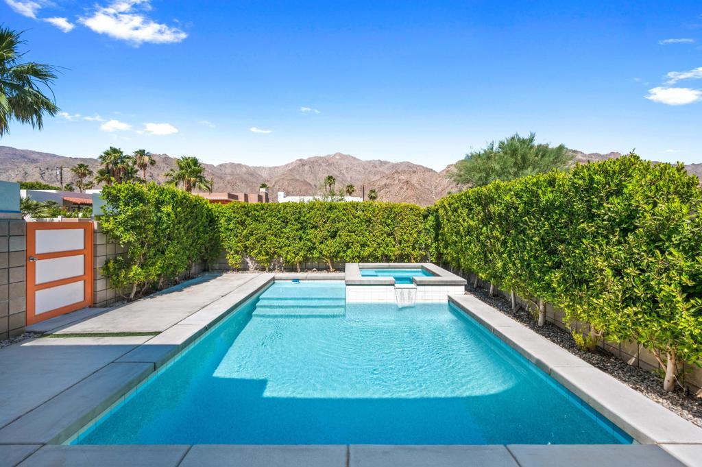 Experience desert living at its finest in this modern La Quinta Cove retreat! This stunning newer home is ideally situated just one block from the top of La Quinta Cove, offering breathtaking mountain views and close access to hiking trails. Enter through the stylish glass and metal courtyard gate into your private desert oasis, complete with a sun-splashed pool and spa featuring a Baja tanning shelf and serene waterfall, perfect for soaking up the sun or relaxing under the stars. Inside, the great room features soaring 15-foot ceilings, a cozy fireplace, 24x24 ceramic tile flooring, and abundant natural light from skylights. The chef's kitchen has an oversized island, quartz countertops, stainless steel appliances, and modern cabinetry. The primary suite opens to a covered back patio and includes an ensuite bathroom with a double-sink vanity and walk-in shower. Two guest bedrooms are located on either side of the second bathroom, ensuring comfort and privacy for guests and family alike. The outdoor living space is perfect for entertaining, with two covered patios accessible from the great room, kitchen, and primary suite. Additional amenities include a newer Lennox A/C (installed in October), smart LED lights, Blink wireless cameras, a Nest thermostat, whole-house surge protector, and an EV charger - all of this and some furnishings are negotiable! Close to Old Town La Quinta and all it has to offer - don't miss out on this desert gem!