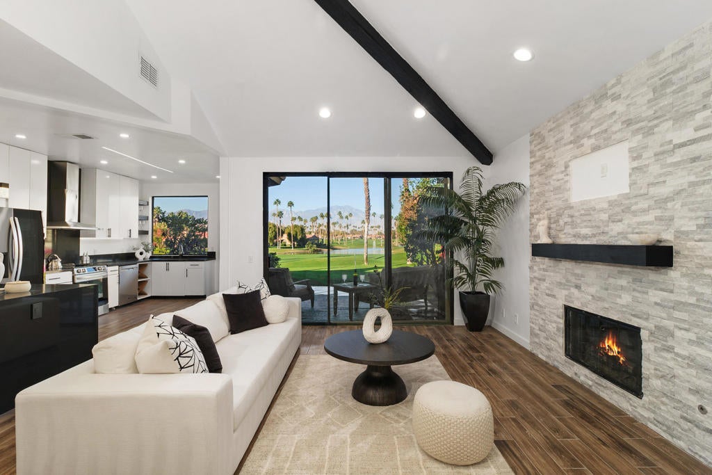 The most EXTRAORDINARY VIEWS AND STYLE in this fully modernized Vista Plan B single-story end unit home. From the moment you enter the home you'll be impressed by the panoramic mountain, water and golf course views. Open concept living, with an expansive stone wall fireplace and an abundance of natural light. The dramatic black and white palette is balanced with rich organic wood tones, creating a chic, inviting atmosphere. From the sleek stone counters to the professional-grade stainless steel appliances, this kitchen is an entertainer's dream. The primary suite boasts a spa-like bathroom with a custom double sink vanity, Illuminated Vanity Mirror and a large walk-in subway tiled shower. Enjoy direct access to a private courtyard patio. The back patio off the Living Room and Kitchen WOWS with stunning SOUTHWESTERN views of the expansive Challenge Course fairway of the 2nd hole; one of the two 18-hole courses designed by Ted Robinson. Upgrades include a built-in beverage bar and wine cooler, custom designer LED lighting, an indoor laundry room, a 2-car garage, ceiling fans, and back-lit defogging vanity mirrors. Palm Valley Country Club is a private resort community offering two Ted Robinson-designed 18-hole golf courses, a beautiful clubhouse with a restaurant and bar, 16 tennis courts, pickleball courts, a Jr. Olympic-sized lap pool and 46 community pools/spas and a spectacular full gym and spa with memberships available for an additional fee. Short-term rentals ALLOWED.