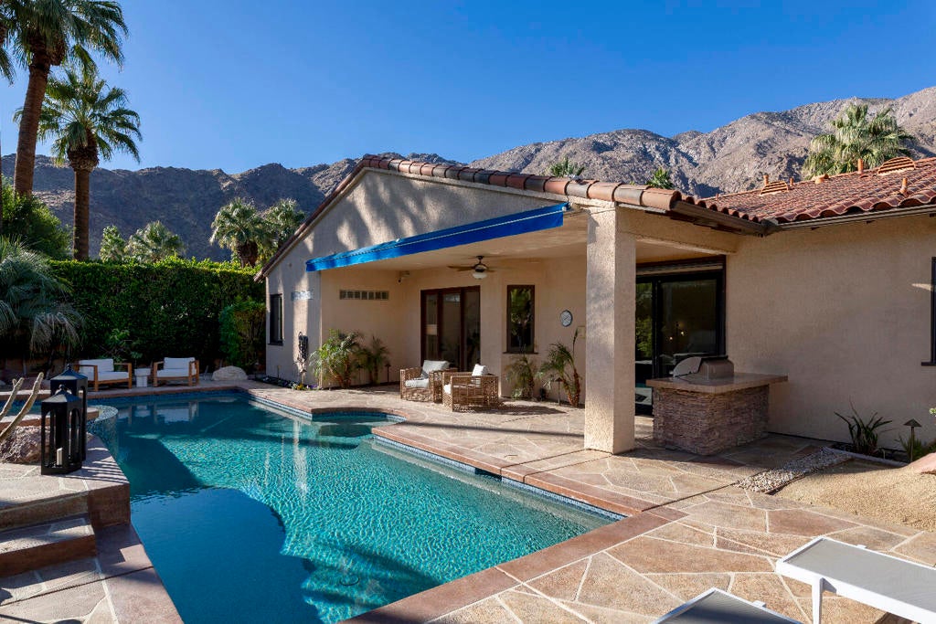 Explore this modern Mediterranean home on Rose Avenue, one of Palm Springs most coveted streets in Vista Las Palmas. This newer villa offers a contemporary design and layout catering to today's lifestyle and fresh aesthetic. The living and dining areas, with 12-foot ceilings, are separated by a gas fireplace and form the main entertaining space, complete with a wet bar. Beyond lies the updated kitchen with a family room, featuring white cabinetry, rubbed bronze hardware, and a glass tile backsplash, which creates a functional yet stylish gathering space. With an eat-in counter, prep island, and large sliding door leading to the backyard, this area blends casual living with seamless indoor-outdoor access.The resort-style backyard features a covered patio with an extendable sunshade, a BBQ station, and a sparkling pool with a spa that includes a built-in seating bench for lounging. While enjoying dining under a pergola, koi swim in the nearby pond with a waterfall. All of this is set against the stunning backdrop of mountain views.Each bedroom features an ensuite bathroom. The two front bedrooms offer mountain views, while the expansive primary suite opens to the backyard and boasts a walk-in closet and spa-like bathroom with a walk-in shower, Jacuzzi tub, and private toilet room.Move-in ready and impeccably maintained, this home combines modern luxury, a prime location, and the potential for personalization in one of Palm Springs' most desirable neighborhoods.