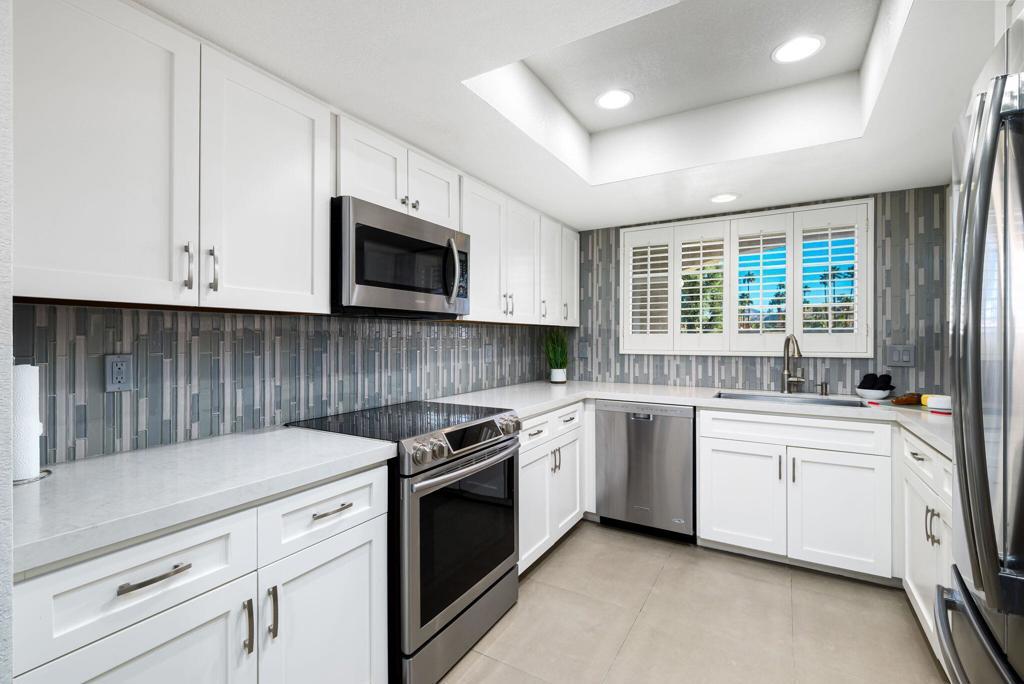 Beautifully remodeled, furnished lower-level condo ready for you to call home! Inside, you'll find tile flooring throughout and an updated kitchen featuring white cabinets, quartz countertops, and a stunning glass tile backsplash.The spacious primary bedroom has sliding glass doors leading to the covered patio, while the en-suite bath offers double sinks and a beautifully tiled shower. A private guest bedroom is located on the opposite side of the condo, accompanied by a guest bath with a shower-over-tub design.The great room is open and inviting, with sliding doors leading to the covered patio, where you'll find full-size washer and dryer units discreetly tucked behind enclosed doors--conveniently located steps from one of the community pools. Mesquite Country Club offers numerous pools, spas, and tennis courts and is located on fee-simple land, so you own the land. This condo is perfect for relaxing or entertaining.The community permits 7-day minimum rentals; best of all, you own the land!