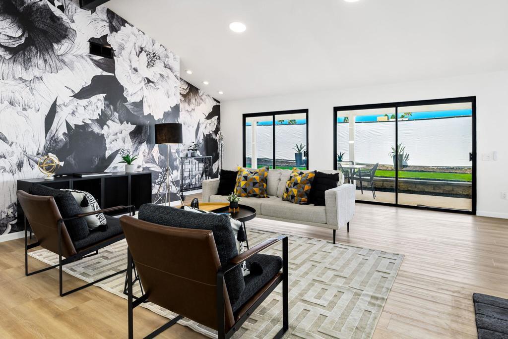 Go check out the competition and you'll see why this home is the best on the market! No HOA. $45K owned solar system conveys with sale, no lease! This beautifully remodeled 3-bedroom, 2-bath pool home in Palm Desert Country Club offers stunning Santa Rosa mountain views and a sleek, modern design. The open floor plan features new warm LVP flooring, an expansive custom designer mural, and a gorgeous kitchen with quartz counters, a glass tile backsplash, bar seating, and stainless steel appliances. The spacious living room boasts a wet bar and a gas fireplace, perfect for entertaining!Outside, relax in the private PebbleTec pool and spa with new LED color-changing lights and a Pentair heater. Your feet will stay cool with cooling technology coating on all exterior concrete. Easy desert landscaping; artificial turf, cacti, and mature palm trees. Construction is nearly complete behind the home, and a permanent fence will soon be installed by the builders. No HOA fees, integrate into this friendly and vibrant community with public access to Palm Desert CC restaurant, bar, and golf course. Perfectly situated on a south facing lot with a private front courtyard. Front 2-car garage with sleek black epoxy flooring. It could be yours; welcome to modern desert living!