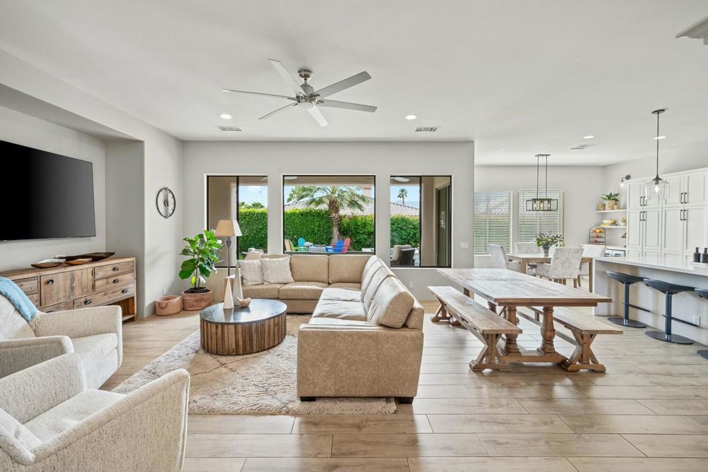 Exquisite Home in The Renaissance Community - La Quinta Discover this stunning single-family residence in the highly desirable Renaissance community, just 2.4 miles from Old Town La Quinta and across the street from dining and coffee shops. This 3-bedroom, 3-bath home features a versatile den, currently a cozy media room, that could serve as a 4th bedroom or home office. Designed for entertaining, the open-concept layout boasts a newly remodeled kitchen with brand-new appliances, a gas cooktop, quartz countertops, fresh white cabinetry, and a striking waterfall island. The primary suite is a tranquil retreat with dual sinks, a spa-like bathroom, and a walk-in closet with custom-built cabinets. Two spacious guest bedrooms share a large full bath, perfect for family or visitors. Step into the backyard oasis featuring a large saltwater pool and spa, creating the ultimate setting for relaxation or entertaining. Additional upgrades include a new HVAC system, modern lighting, upgraded pool lights, and a state-of-the-art Culligan water softener and filtration system. Designer furnishings are available for purchase outside of escrow, making this home truly turnkey. Don't miss the opportunity to experience this one-of-a-kind property. Schedule your private tour today!