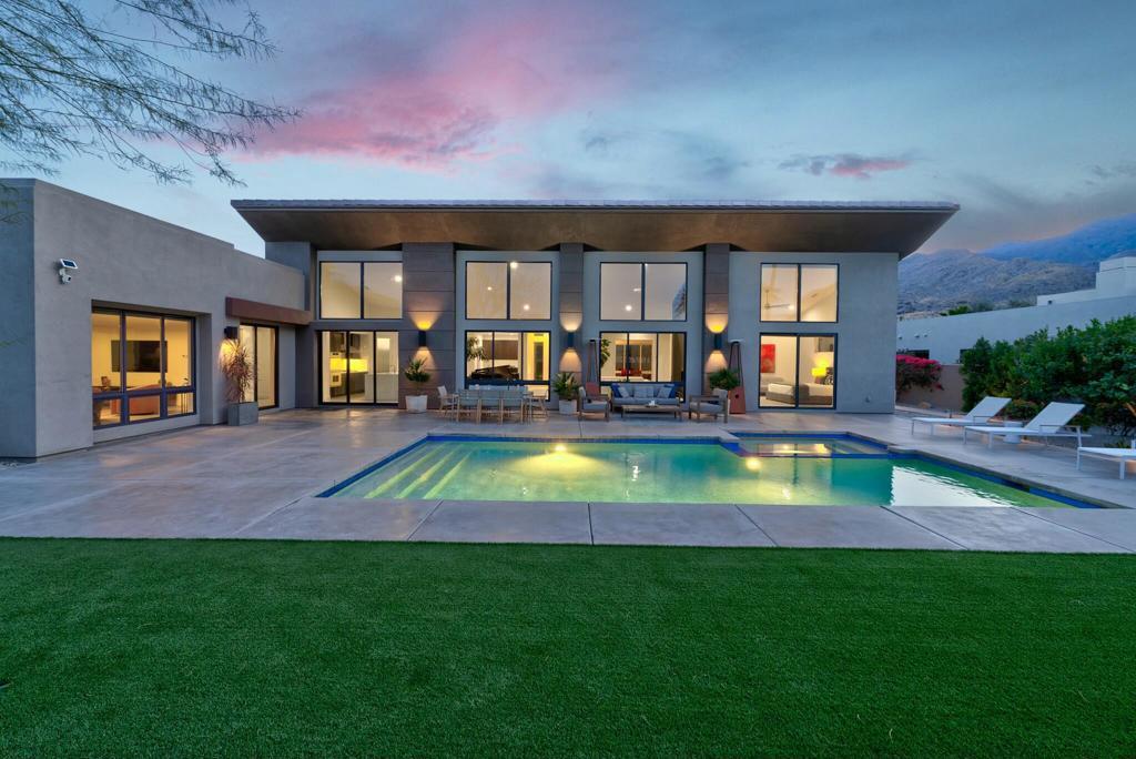 Experience desert modernism at its finest in this turnkey luxury residence located in the exclusive Alta community. With 3 ensuite bedrooms, an office, a bonus room, and an expanded formal dining room with direct access to the recently designed private patio, this home is tailored for both relaxation and entertainment. The floor-to-ceiling windows allow natural light to flood the interiors while showcasing breathtaking views. New grand-scale tiles throughout and a reimagined chef's kitchen featuring an oversized island with bar seating and upgraded sleek finishes make this home ideal for entertaining. Enjoy ample space in the newly landscaped outdoor areas, including the vast front patio and backyard, which provide a range of elements: an expansive pool and spa, multiple sitting areas, and captivating southern and western mountain views. Alta's architecturally distinctive homes are set amidst the stunning South Palm Canyon backdrop, offering residents a unique blend of privacy and luxury. The 3-car garage and owned solar system complete this magnificent, fully furnished home, ideal for full-time residents or investors seeking immediate rental income potential for the season. Just minutes from downtown, this home provides easy access to dining and cultural attractions, as well as nearby hiking trails and golf courses.