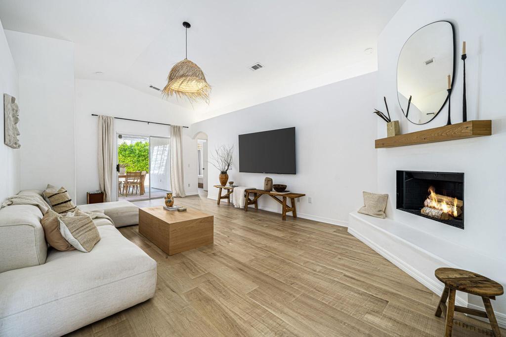 Enhanced by views of the magnificent Santa Rosa Mountains, this reimagined La Quinta Cove home is offered with designer-selected furnishings. Embraced by a spacious homesite adorned with fresh landscaping, the single-level residence reveals a trio of bedrooms and two baths in approx. 1,479 s.f. Warm, light and calming, the interior showcases a vaulted ceiling over seamless living spaces, which include a living room with courtyard access and a custom smooth-coat fireplace with raised hearth and wood mantle. A view-enriched bay window with custom built-in seat illuminates the dining room, and the kitchen presents white cabinetry, a custom plaster vent hood, white countertops, fashionable brass hardware, a walk-in pantry, and stainless steel appliances including a French door refrigerator and a range with five-burner cooktop and griddle. Highlighting the talents of the owners, who are professional interior designers, the timeless aesthetic of this home continues in a remodeled guest bath with marble flooring, and a primary suite that opens to the backyard and hosts a walk-in closet, sitting area and two sinks. Enjoy new light wood-grain luxury vinyl plank flooring throughout, upgraded lighting inside and out, new AC, an attached two-car garage, and a laundry closet with LG ThinQ stacked washer and dryer set. The backyard is private and spacious, with ample room on a large patio and lawn for entertaining and relaxation.