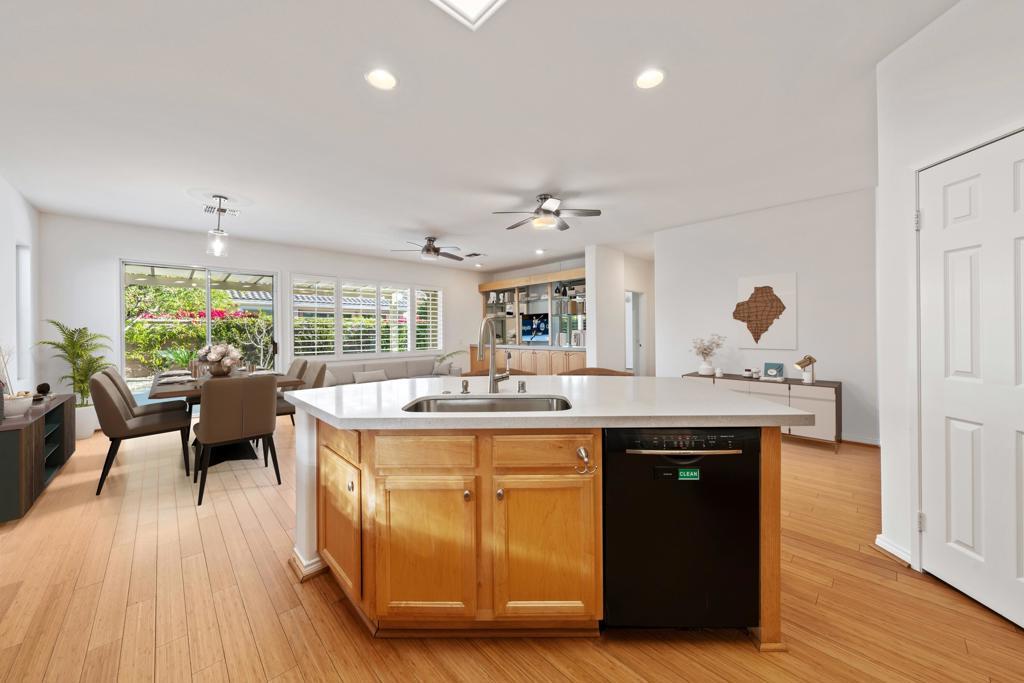 Sun City Palm Desert - St. Maarten. This popular great room home has 2 bedrooms, 2 bathrooms and a den. The spacious rear yard features an extended tile patio, alumawood patio cover and desert landscaping. A gated courtyard with south facing flagstone patio provides curb appeal and function. Inside, hardwood flooring is in all but the primary suite bathrooms which is tile. Shutters are throughout. The greatroom has a slider to the rear patio and a custom media center. The kitchen features quartz countertops and a chef's island with breakfast bar. Off the greatroom is a den/office with custom desk and shelving. The primary suite has a bay window and a large walk-in closet. The primary suite bathroom has a sitting vanity with granite countertop, upgraded sink and fixtures. The guest bathroom also has a vanity with granite counter, upgraded sink and fixtures along with a spa tub/shower. The guest bedroom has walk-in closet. Laundry is located inside the home. The 2-car garage has room for lots of storage.