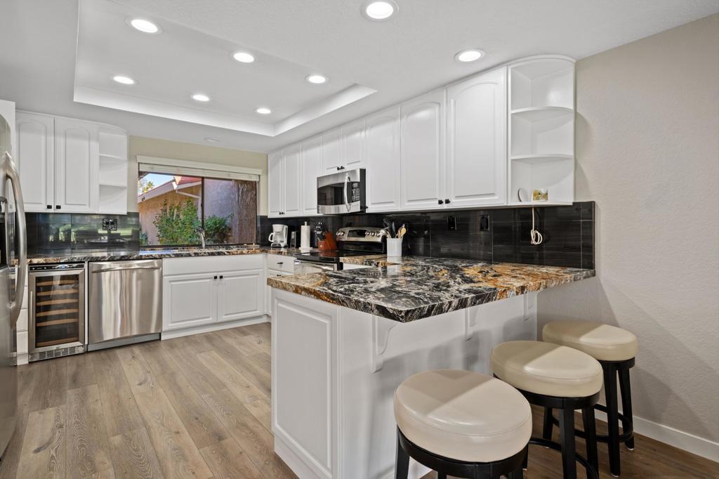 Beautifully maintained home with GORGEOUS SOUTH MOUNTAIN/FAIRWAY VIEWS! Wood plank-style tile flooring, white cabinets, stainless steel appliances. ENCLOSED ATRIUM with skylight, extended, tiled patio with pony wall. Just 2 doors from the pool/spa. REMODELED BATHS, shutters and gated walkway. Garage has plenty of storage, EXTRA LONG DRIVEWAY for added parking. Easy access to the front gate. VIEWS of the 3rd and 4th fairways. All furnishings as viewed are included!