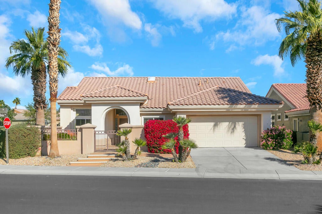 This beautifully maintained Lalique plan 2 bedroom 2 bath home is situated on a private corner lot with no neighbors on one side or behind. Just a short walk or golf cart ride to the Mountain View Clubhouse and Rec Center, this home offers both convenience and a resort-like lifestyle. Inside, you'll find high ceilings, plenty of storage space, and ample closets. The open floor plan creates an airy feel, with formal dining in the living area and an additional TV area in the den. The light-filled kitchen features a breakfast nook and ample storage. Bedrooms are thoughtfully separated for privacy, with tile flooring in the living areas and bathrooms, and carpet in the bedrooms. This home is wheelchair-friendly, with wide-slat plantation shutters and sun shades adding comfort and style. Outside, relax on the covered patio or gated courtyard, surrounded by low-maintenance landscaping. The long driveway and extended garage provide parking for two cars, a golf cart, and additional storage. Sun City Palm Desert's exceptional amenities include golf, pickleball, tennis, bocce ball, a fitness center, doggie park, RV parking, lakes, and more. Don't miss your chance to enjoy desert living at its finest!