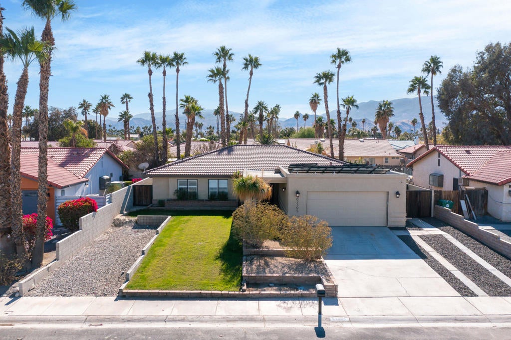Nestled in the desirable Rio Vista community, this beautifully remodeled 3 bedroom, 2 bathroom home offers a serene desert retreat with nearly panoramic mountain views. From the moment you step inside, you'll be captivated by the bright, open floor plan and seamless flow between indoor and outdoor living spaces. The spacious living area is perfect for both relaxing and entertaining, while the newly renovated kitchen boasts sleek quartz countertops, modern finishes, and abundant natural light. The oversized primary bedroom offers a peaceful sanctuary with direct access to the backyard oasis, featuring a luxurious, spa-like ensuite bath and walk-in closet. Step outside to enjoy your very own private retreat--an exquisitely landscaped backyard with a pool, spa, and beautiful mountain views. This is the ultimate space to relax, entertain, or soak in the beauty of the desert landscape.Additional highlights include an 18 SEER HVAC system installed in 2022, leased solar panels for energy efficiency, ample parking options accommodating multiple vehicles and a designated area for an RV, boat, or other large vehicle, and proximity to world class golfing at Desert Princess Country Club.Located in the heart of the Coachella Valley, this exceptional home is minutes from world class shopping, dining, & entertainment in downtown Palm Springs, PSP airport, and I-10. Don't miss your chance to own this resort-style desert paradise, where luxury, comfort, & breathtaking views await!