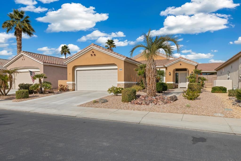 Sun City Pam Desert - FABULOUS great room floor plan that has been REMODELED froman original Barbados. A spacious 2 bedroom plus 2 baths in a GREAT section of Del Webb near the Lakeview Clubhouse!. This home shows pride of ownership EVERYWHERE and is available TURNKEY FURNISHED with high quality furniture! Beautiful curb appeal with newly painted exterior including stacked stone and tropical landscaping! Enter into an extended great room with custom wood unit to include TV, Bose sound bar and speaker cabinets and accessories. Continue to formal dining area with views to the back patio! New custom Jeld-Wen sliding door with a life time warranty of the integral thin blades that provide privacy and light control. Sullivan Shutters are throughout the home. Casual dining area has a bay window with more views to the back patio, along with another custom cabinetry unit to store all of your entertaining items. Kitchen has beautiful Wellborn cabinets in light maple. An extra cabinet has been added for more storage! There are beautiful quartz countertops and stainless steel appliances. The refrigerator is a French door with ice on the door PLUS an extra drawer! The sink is a two basin granite sink with custom faucet. All rooms adjacent to the great room have lovely crown molding and custom painting.