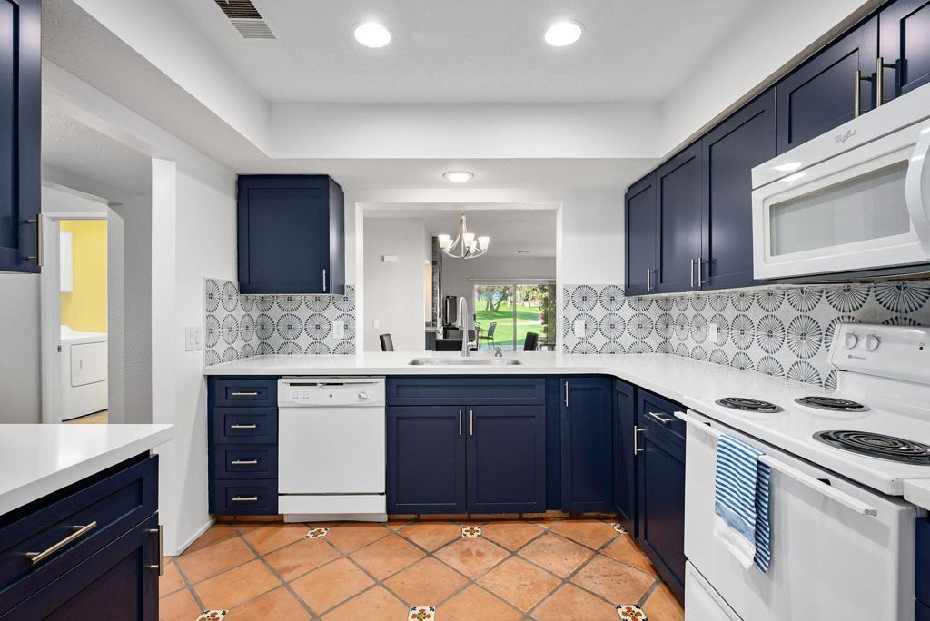 This METICULOUS & TURNKEY FURNISHED 2 bedroom, 2 bath condo, END UNIT, on the 12th Tee with layers of west views was WORTH THE WAIT! As you enter you are greeted with Saltillo Tile floors, Custom Fireplace, and New Paint! The beautifully remodeled kitchen has been tastefully redesigned with BLUES & WHITES, Quartz countertops, full backsplash New and Cabinets. In addition, you have a NEW washer & dryer. As you find your way to the bedrooms you will find NEW CARPET and VIEWS off the Master Bedroom. The 2 car garage is ''finished and painted!'' Desert Falls Scottish Links Championship Golf Course is rated as one of the top 10 courses by the SCPGA and awarded a 4 -star rating from Golf Digests ''Best Places to Play''! You can choose to pay as you play. Desert Falls Country Club is the ''FUN CLUB'' with monthly activities. Enjoy Tennis, Pickleball, Fitness Center, Restaurant/Bar, and 32 Pools & Spas. Centrally located in the middle of the valley within walking distance to restaurants and shopping and only a few miles to top entertainment venues. Acrisure Arena, Agua Caliente Spa & Casino, the McCallum Theatre and El Paseo: a 2-mile boulevard of upscale Galleries, Boutiques, and fine Dining. As you sit out on your breathtaking patio with picturesque views, you can enjoy a good book or an iced tea as you watch your friends try to hit their ball over the water all afternoon!! This home is not to be missed! Call Today for your private tour