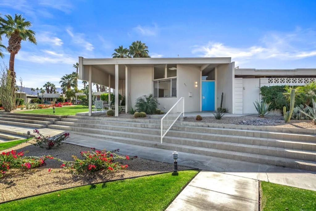 Mid-century Sandpiper gem with a picture-perfect view! This well preserved Wm.Krisel-designed condo is a rare find, showcasing timeless original architectural features like exposed concrete block walls, tongue-and-groove ceilings, and clerestory windows. The condo retains its authentic charm with original windows and sliders, kitchen cabinetry, bathroom cabinetry, and even the outdoor laundry area with a washer and dryer off the primary bedroom patio.The main living area boasts high ceilings, creating a seamless flow from the living room to the kitchen, which features original cabinets, formica countertops, and vintage appliances. Step outside to your poolside patio and enjoy breathtaking views of the lush landscape and pool area, all set against the stunning northeastern backdrop of the mountains.Perfectly situated just minutes from shopping and dining on El Paseo, this is your chance to own a true piece of mid-century history and make it your new desert retreat!