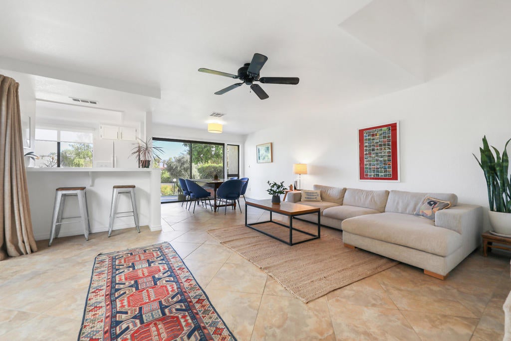 Welcome to Mountain Villas. This lovely Condo is the in the heart of quiet South Palm Desert. Three pools, tennis/pickleball courts, and a small clubhouse create a resort living experience. Close to the many restaurants and shopping on El Paseo for great entertainment opportunities. And yet the beautiful views of this condo overlook the greenbelt and the mountains to the north, to create a peaceful and private setting for this home. Additional features of this well maintained condo include a large 2 car garage with extra storage, LG smart washer and dryer, new insulation in attic for energy efficiency, beautiful custom built-in bookcase in primary bedroom, custom tile in living room, bright remodeled kitchen with new quartz countertops, and a newly renovated primary bath.