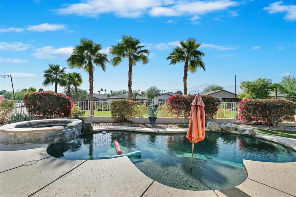 MAJOR PRICE REDUCTION! Welcome to your paradise. Home is on the border of La Quinta and Indio. It is on a short cul-d-sac previously used as the model park for Indian Springs. It is sitting on a large lot with incredible views from the backyard with a green belt area over the fence that gives you a wide open space. An impressive custom built pool and spa that will make you feel like everyday is a vacation day. In the backyard is a wonderful detached casita with a pathway to the side gate along with a shed that will be left for your storage needs. Owner built an incredible fire pit that warms you up on those chilly desert nights. A large covered patio is perfect to keep the sun off your head. Inside the home you will have newly installed laminate wood flooring throughout large living area. A large bookshelf is another detail that the owner custom built as well. The kitchen is large enough to have room for entertaining with a lot of counter space with an area to set up all your food. Many cabinets to store all your pots, pans, dishes and all your kitchen needs along with a walk in pantry. Exterior of home was painted in 2020. Has newer carpets in bedrooms and bathrooms have been updated. So including the casita you have 4 bedrooms and 3 baths for the setup that will suit your family or guests. There are large windows and sliding glass doors that let in a lot of natural light. Come take a look at this beauty of a home and you'll see that this is what you've been looking for!