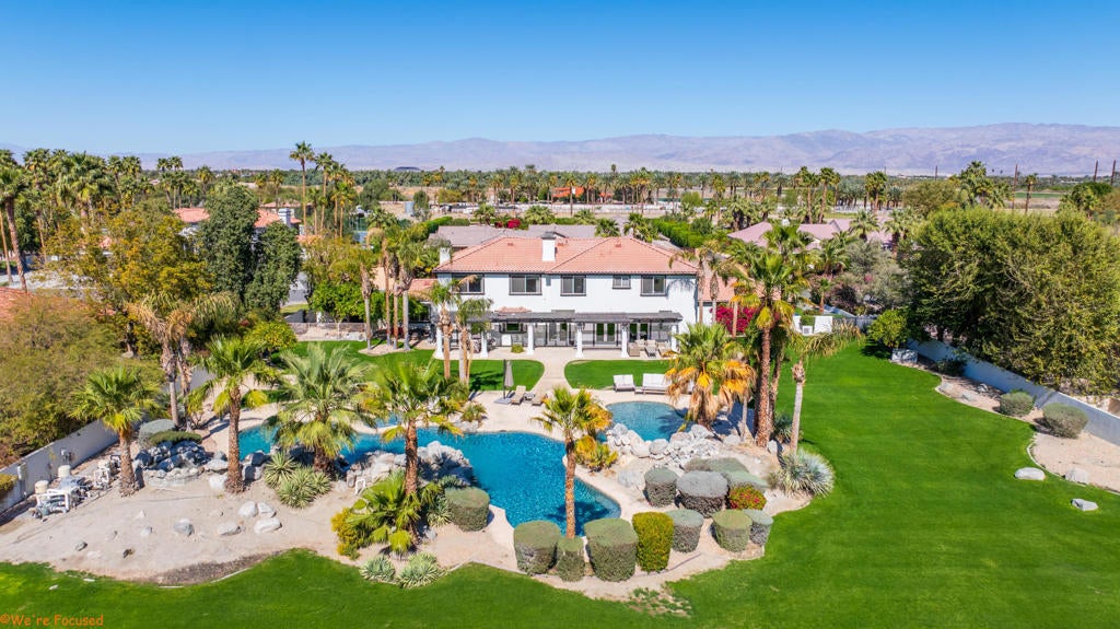 Nestled within the exclusive gated community of Estates at La Quinta, this exquisite two-story home offers an unmatched blend of luxury, comfort, and desert charm. Spanning over 5,200 square feet on a fully fenced 1.25-acre lot, this estate boasts 6 spacious bedrooms and 4.5 elegantly appointed bathrooms.The heart of the home is a grand resort-style lagoon pool, newly surfaced with Aqua Blue Pebble Tech, featuring three impressive rock formations with cascading waterfalls. A massive jacuzzi, accommodating up to 14 guests, and a natural outdoor BBQ area surrounded by ample patio furniture create an entertainer's dream setting under the expansive desert sky.Inside, the open-concept design flows seamlessly from the updated gourmet kitchen--highlighted by granite countertops, a designer range hood, and custom wooden cabinetry--into a large great room adorned with one of two cozy fireplaces. The home also features a dedicated library room and a game area with both a pool and poker table, ideal for gatherings.Five bedrooms are furnished with plush king-sized beds, while the sixth offers two queen beds, comfortably sleeping up to 14 guests. The oversized master suite is a true sanctuary, complete with its own fireplace and recently remodeled restroom. Additional features include tile and hardwood flooring throughout, a dining area with seating for 10, and a charming breakfast nook for 6. With breathtaking south-facing mountain views from the great room, kitchen, dining room, master bedroom, and two additional bedrooms, this property is a serene desert retreat and the ultimate entertainer's paradise.Priced to sell, this is the lowest-priced home within this prestigious gated community. Ready for the personal touches of its next owner, this desert oasis awaits.