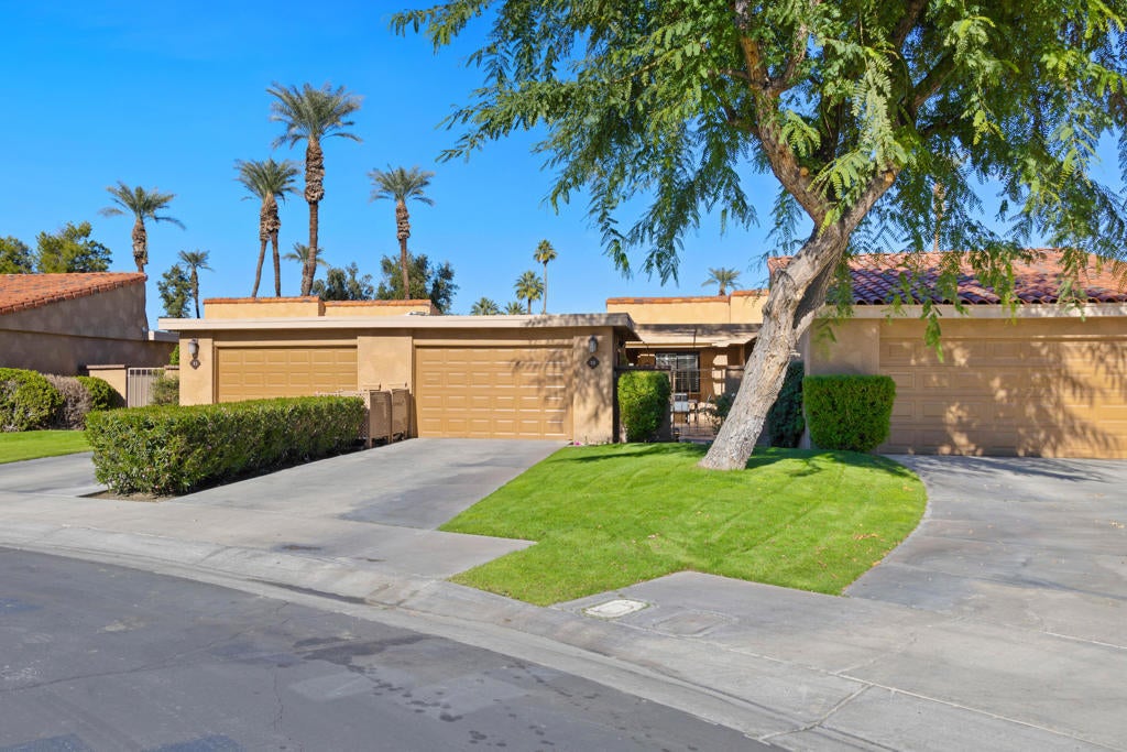 Great location in Cul-de-sac and close to pool and spa. Important upgrades include new Milgard windows and doors (2021), new A/C, Heating, new Water Heater (2023) and new Garage opener. This turnkey furnished, 2 bedroom and 2 bath condo overlooks the 8th Fairway from a lovely shaded back patio. A Granite Counter kitchen has a pass through window to the spacious front courtyard that is landscaped with a drip system for the hedges and flowers. The condo has a very comfortable vibe for relaxing, watching the game and entertaining. There are high ceilings in the living room and large windows overlooking the golf course. Sunrise Country Club in Rancho Mirage (Member owned!) is considered one of the ''friendliest'' Clubs in the Coachella Valley. Featuring Golf, Fitness Center, Tennis/Pickleball Courts, Bocce Ball, Clubhouse with Fine Dining, a Casual Grille and The ''Mixx'' where everybody knows your name. Tons of social activities and fun events. Golf Membership is separate (super affordable!) but all other amenities are included with HOA fee: 24 hour Guard Gate, Cable, WiFi, trash, common area landscaping including front of condo, 19 pools and spas, roofs and facia, and driveways. There's quite a bit offered here in this peaceful and quiet desert community.
