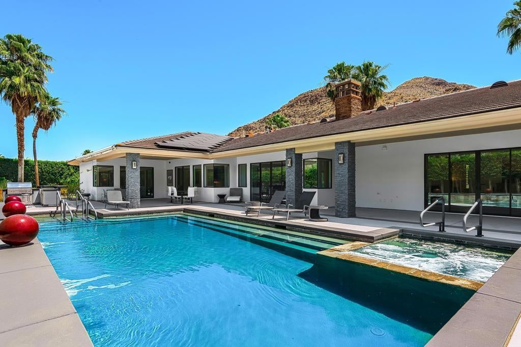 Location! Location! Half an acre parcel, w/NO HOA, NO INDIAN LAND LEASE & In Pristine Andreas Hills. Needs some updating kitchen and baths. Houses across the street are$4-$5M active now. Just take a look at this 4,913 SQ.FT. contemporary residence. Primary suite approx. 1500 Sq.Ft. w/ white oak wood floors, dual marble baths w/Hansgrohe fixtures, motorized sun shades, Fireplace, dual organized walk in closets, AND sitting rm or gym! Beautiful built-in office,plantation shutters and two additional guest suites includes baths & w/walk-in closets. Plus powder bath/pool bath. Huge 4 car garage w/epoxy coating. Commercial grade KW solar panel system, owned. Remember, this was custom built and w/substantial concrete tile roof. Courtyard entry w/granite tower fountain, iron doors lead to formal foyer w/white porcelain flooring and crisp, white 12FT. gallery walls. Black absolute granite slabs combined w/ warm, wood cabinetry accents this home. Captivating mountain views thru every window. & sliding glass door. Great room /kitchen w/2 islands & richly appointed Thermador Series suite of appliances. Living room is large enough for a concert grand piano too! Fireplace and lovely builtins adorn this room. Sparkling swimming pool & spa w/sheer water descent feature,surrounded by tall,stately Ficus trees provides much privacy for your outdoor desert lifestyle. Backyard w/ Lynx BBQ center w/island, retractable awnings, 2 outdoor showers and outdoor firepit. It needs some TLC. Location! Location!