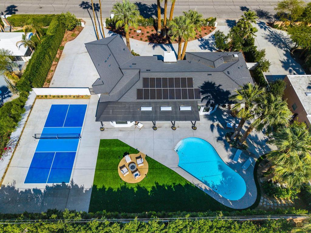 Stunning Albert Frey Estate in Movie Colony East Ace Your Next Move: Own a Palm Springs Estate with Private Pickleball CourtWelcome to your Palm Springs dream retreat! This exceptional estate, originally designed by renowned architect Albert Frey, sits on an estate across from the South end of Ruth Hardy Park in the highly sought-after Movie Colony East neighborhood. Just minutes from downtown, this home seamlessly blends timeless design with modern luxury. Experience the ultimate entertainer's paradise in this completely redesigned interior, where sleek terrazzo flooring and an open-concept layout showcase the home's breathtaking mountain views. Sliding bi-fold doors create a seamless transition between indoor and outdoor living, leading to a resort-style backyard oasis with saltwater, a pebble-tech heated pool, and a cozy firepit lounge. Invite your friends over for a 'Dink'. on the newly added pickleball court--with a roll-away net for multi-purpose sports and events--offers endless possibilities for fun, while a circular driveway, privacy hedge, up lighting, and lush landscaping enhance the home's exclusive ambiance. Perfect for hosting unforgettable gatherings against the backdrop of stunning desert scenery! The chef's kitchen boasts a grand island, ZLINE Attainable Luxury Appliances wine fridge, double oven, gas stovetop with griddle, range hood, serving counter, soft-close cabinetry, generous island, dining area, and a spacious walk-in pantry. The separate dining room overlooks the pool, offering an elegant gathering space. The primary suite features a built-in beverage fridge and countertop, ideal for a coffee bar. The spa-inspired bathroom includes floating dual-sink vanities, a walk-in shower, a freestanding soaking tub, and a privacy window for soft natural light. A walk-in closet with a skylight adds to the suite's refined ambiance.**2023 Dual HVAC, **Solar Paid, and a New Roof This one-of-a-kind estate offers unparalleled design, privacy, and convenience--all in the heart of Palm Springs. Don't miss this rare opportunity!