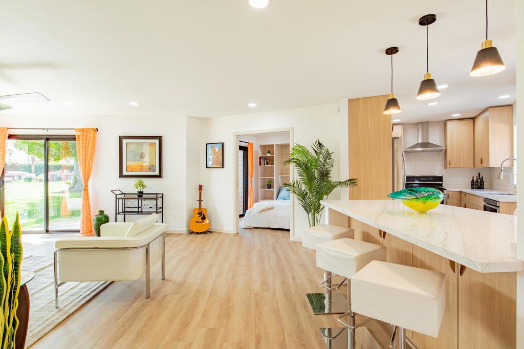 Gorgeous unobstructed mountain, lake and golf course views from this completely remodeled home. Has a second spacious bedroom/den/office with living rm and patio access. Also included is a murphy bed making it the perfect flex space for an office or overnight guest. The beautiful curb appeal and walkway leads you to a private gated entry patio landscaped to perfection. New clear glass French door gives added light to the entry. The generous entry leads to a large open floorplan living room offering patio access and those stunning views. The main living area is open to a built-in dining area with seating for six comfortably complete with a custom quartz slab top. This space also works as a perfect space for a buffet at larger gatherings. All of this is open to an all-new stunning modern kitchen with contemporary light wood cabinetry, stainless-steel high-end appliances, more beautiful quartz countertops and tiled backsplash. The kitchen sink and dining space overlooks yet another beautiful private landscaped patio with BBQ hookups perfect for private outdoor dining. The adjacencies of these spaces are so convenient for an easy-going lifestyle. There are two remodeled bathrooms. One being an en suite to the generously sized primary bedroom with large walkin closet and yet more greenbelt, water and mountain views. Both bathrooms have custom tiled showers, new plumbing fixtures with rain heads, new cabinetry, vanity lights and mirrors. Other features of this spectacular home include a direct access two car garage with laundry hookups, upscale wide plank waterproof flooring, recessed LED lighting throughout, new door and cabinet hardware, shower enclosures, oversized dual pane sliders to all outdoor spaces and more. There is so much this completely remodeled condo has to offer. Come see for yourself and see what this lovely well-located golf and clubhouse community has to offer. At this price and terrific extended very reasonable land lease this home will not last long. Open House Saturday and Sunday's from 11 am to 3 pm