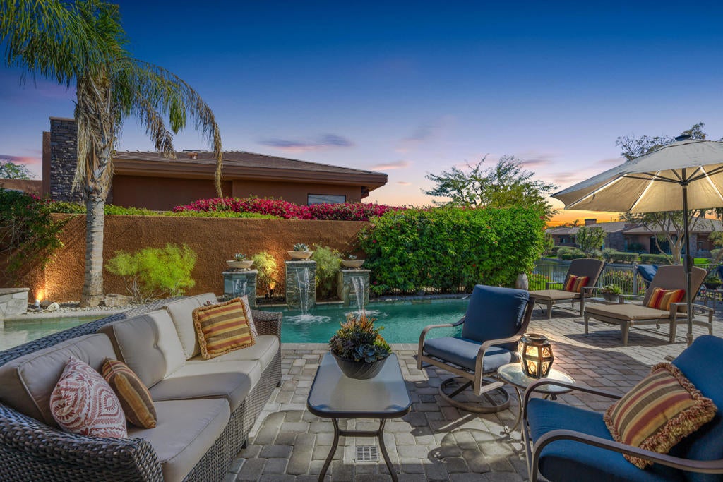 Welcome to Palmilla - A National Award-Winning Desert OasisExperience elevated desert living in Palmilla, one of the Coachella Valley's most prestigious and architecturally celebrated communities. This stunning Ocotillo floor plan offers a rare blend of tranquil partial lake views and total backyard privacy, all within a fully turnkey furnished home designed for both relaxed luxury and effortless entertaining.The heart of the home features an expansive open-concept great room that seamlessly connects to the gourmet kitchen, sit-down bar, and sunlit breakfast nook. Culinary enthusiasts will love the kitchen's Thermador stainless steel double ovens, gas cooktop, built-in microwave, prep island with sink, and walk-in pantry. The space flows gracefully outdoors through massive stacking sliders, blurring the line between indoor and outdoor living.Step into your resort-style backyard, complete with a saltwater pool and elevated spa with powerful turbo jets, misting system that wraps the entire patio, built-in BBQ island, fire pit with lake views, and multiple lounging and dining areas--perfect for morning sun and shaded, cooler afternoons. A newer AC unit for the main living area and an upgraded pool heater ensure year-round comfort and performance.At the center of the home is a charming private courtyard, accessed by the guest suite, detached casita, and formal dining room. Anchored by a rock water fountain with soft uplighting, this space brings the outdoors in, filling the home with the soothing sound of water and fresh desert air--creating a peaceful ambiance throughout the interior.The spacious primary suite offers a luxurious retreat with dual vanities, a soaking tub, walk-in shower, and two custom walk-in closets. The guest suite and casita each have their own en suite bathrooms, offering privacy and comfort for family and guests.Palmilla provides 24-hour manned security, front yard maintenance, and exterior home painting, supporting a carefree, lock-and-leave lifestyle. With a membership to The Citrus Club, homeowners enjoy private gate access to the club--just minutes away--featuring championship golf, upscale dining, fitness, and vibrant social events. Restaurants and shopping are within easy walking distance.This home exemplifies true indoor-outdoor desert living at its finest.Schedule your private tour today--your Palmilla escape awaits.