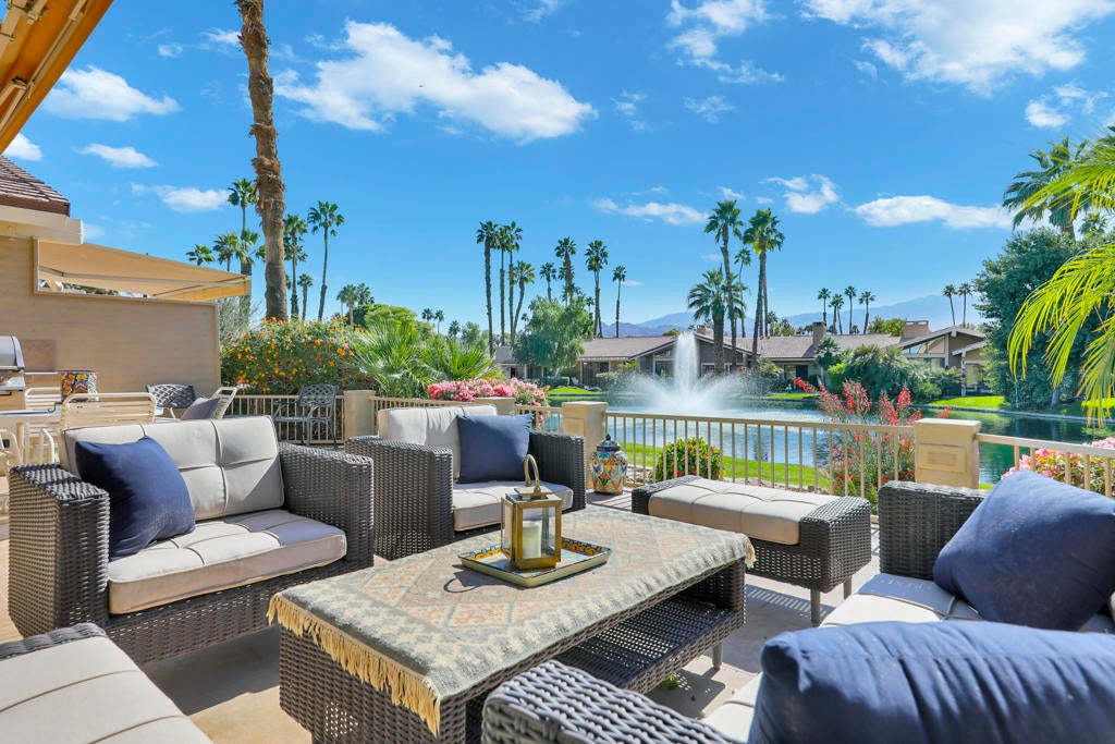 2-Bedroom + Den Condo with Spectacular Views! Spacious living room with soaring ceilings and a cozy fireplace. The atrium has been converted into a spacious dining room with a skylight for abundant natural light. The ample den has a built-in office area.The kitchen features a 5-burner Wolf gas cooktop and stainless steel appliances. Anextended sun-drenched south facing patio, tiled and fenced, with a built-in BBQ, retractable awning, and wonderful mountain and water views. A nicely landscaped courtyard entry leading to a 2-car garage with plenty of storage and a golf cart. Offered furnished for a seamless move-in experience.Located in The Lakes Country Club, offering 27 championship holes of golf, a state-of-the-art fitness center, a premier racquet center, and a newly remodeled clubhouse. It's more than a home it's a lifestyle.