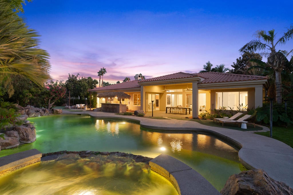 Resort-style living awaits at Indian Wells Country Club, nestled within the Mountain Gate community. Boasting a low HOA dues of $90 p/month, this property offers four en-suite bedrooms, with the fifth currently utilized as an office. Each bedroom features walk-in closets.Upon entering the home, the expansive open floor plan, high ceilings, and oversized windows and doors create an inviting ambiance reminiscent of a backyard oasis. Two prominent water features and a spacious spa, complemented by a large tanning shelf, draw attention to the pool. Lush landscaping, including citrus trees provides privacy in all directions.Adjacent to the pool, a tiki bar equipped with a fully functional kitchen and barbecue grill overlooks an extra-large putting green, featuring two additional fountains. The open floor plan seamlessly transitions into a spacious family room, leading to an expansive patio and pool. Additional features include a stone fireplace in the family room, large kitchen pantry, and oversized tile floors throughout the residence. A three-car attached garage with ample storage and a large concrete side yard. Indian Wells CC offers membership options and discounts at Indian Wells Resort for golf, restaurants and shops. Also, close proximity to Tennis, El Paseo and restaurants