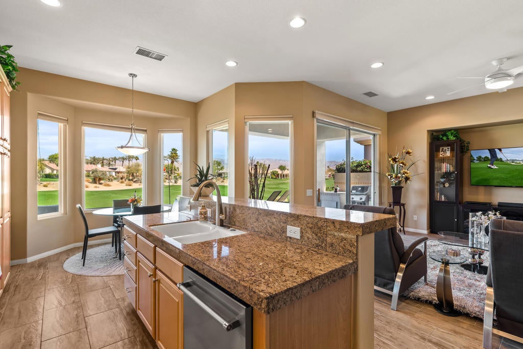 Beautiful 3 BED 3 BATH home with fantastic golf and mountain VIEWS on the 16th fairway in Heritage Palms C.C. Located close to the clubhouse, this well kept and move-in ready home has a front courtyard welcoming you to a dramatic custom glass double door entry, an open layout design with porcelain tile flooring, replaced and upgraded rear view picture windows and a mirrored dining area. Featuring granite kitchen counters, wall ovens with gas cooktop, plantation shutters and light maple cabinetry throughout. The spacious master suite has dual vanities, walk-in and bi-pass closets with built-in organizers and separate soaking tub and shower. Bedroom 2 has its own private bath with large shower as well. The front and rear patio also have an attractive sandstone design overlay. Additional upgrades include the optional GOLF CART GARAGE with separate door, mini-split A/C unit in garage, hanging racks, updated main A/C unit along with the water heater, dishwasher and exterior paint. Heritage Palms is a premier 55+ adult community featuring an 18 hole championship golf course, pickle ball & tennis courts, indoor & outdoor pools, fitness center, grill room, billiards room, card rooms and more.
