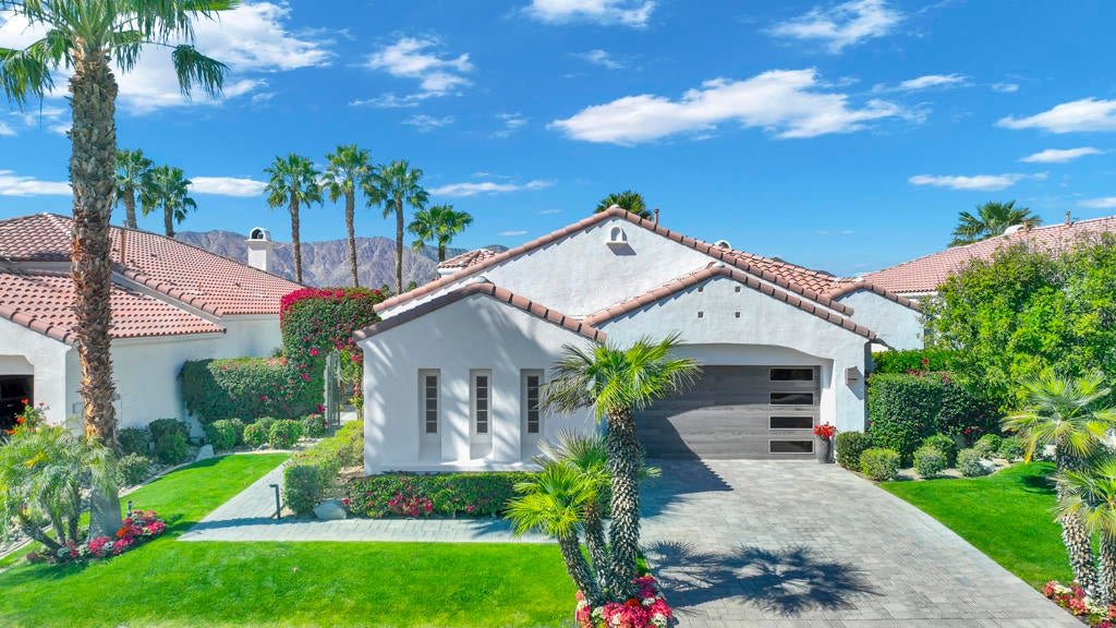 Majestic South & West mountain views overlooking the double fairways of holes #13 & #14. If you're looking for GOLF there is a Golf Membership transfer available for purchase. This stunning upgraded home is immaculately maintained! A private gated courtyard entry leads to a desert home oasis. 13' coffered ceilings compliment the open living area with customized fireplace with fire & ice accented by a natural granite floor to ceiling facia. and contemporary custom wall accents. Wrap around wet bar & dining area are all open to the spacious living area with windows galore to bring the beautiful view in, morning to sunset. Gourmet kitchen has been upgraded with leather textured granite counter tops, & upgraded appliances & convenient pull outs. A relaxing corner seating area to usurp the amazing views or just take in a good read accents the beautiful kitchen. The popular Camina floor plan offers 3 spacious bedrooms all ensuites for your guests privacy & comfort. The primary suite offers a luxurious bathroom with dressing area, a huge closet, a private serene patio and builtin decorative wall shelving with convenient quiet corner desk. The gorgeous powder room is tastefully upgraded with metallic touches & under lighting to the custom built counter & sink. The expansive customized patio with builtin heaters, outdoor fans, dining and seating & lounging areas overlook the sparking pool & spa with waterfalls. Your own resort overlooks the spectacular views of the Santa Rosa mountains, changing colors all day by the sun's direction & absolutely BREATHTAKING colorful SUNSETS!!! This home boasts of a Paradise setting! The two car plus golf cart garage has epoxy floors & builtin cupboards for lots of storage convenience.