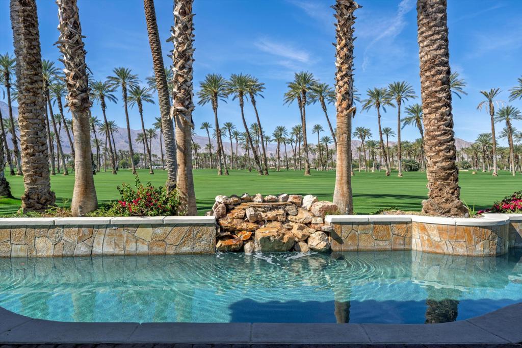 Welcome to The Palms, a premier golf destination in La Quinta. This stunning estate home sits on the 14th hole of the Couples/Curley-designed course, offering breathtaking mountain views framed by swaying palms. Step into your private backyard oasis, where a custom 90+ ft pool/spa with swim-up stools, a BBQ island, and a tanning shelf create the ultimate resort experience. Enjoy luxury outdoor living with a misting system, fire pit, putting green, motorized retractable awnings, and sun shades. Crafted to the highest standards, the home features travertine flooring, crown molding, pavers, slab granite/marble, and high-end finishes throughout. The chef's kitchen boasts custom cabinetry, stainless steel appliances, and ample space for gourmet cooking. Wake up to stunning views from the primary suite, while guests enjoy a spacious two-room casita offering privacy and comfort. The Palms community, now attracting new members from everywhere, has recently undergone a stunning clubhouse renovation. Enjoy low HOA dues, a dog park, and well-priced golf memberships. Offered furnished per inventory.
