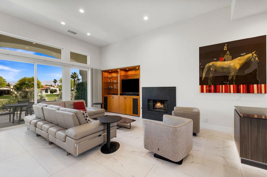 Price cannot be beat for this exquisite waterfront home in the renowned Indian Ridge Country Club, Palm Desert. Set on an elevated lot along the 2nd hole of the Arroyo course with 180-degree views of the golf course and mountains, this remodeled Bougainvillea 1 floor plan combines contemporary design with exceptional craftsmanship. Throughout the home, enjoy large format Italian porcelain floors, a newly painted interior, dimmable LED downlights, and modern baseboards that define the refined living space. The gourmet kitchen is a chef's dream with high-end Dacor appliances, an oversized island, custom Italian cabinetry with pull-outs, sleek quartz countertops, and a striking 3-D beveled glass backsplash, ideal for hosting gatherings or intimate meals. The primary suite offers a spa-like retreat, with a hydro system freestanding tub and seamless walk-in shower with frameless glass. Custom Italian cabinetry, quartz countertops, LED mirror, and pendant lighting enhance the tranquil atmosphere. The spacious back patio offers the potential for a custom private pool, adding to the resort-style living experience. List price is unfurnished. Some furnishings may be available outside of escrow. Club Membership is available with no wait.