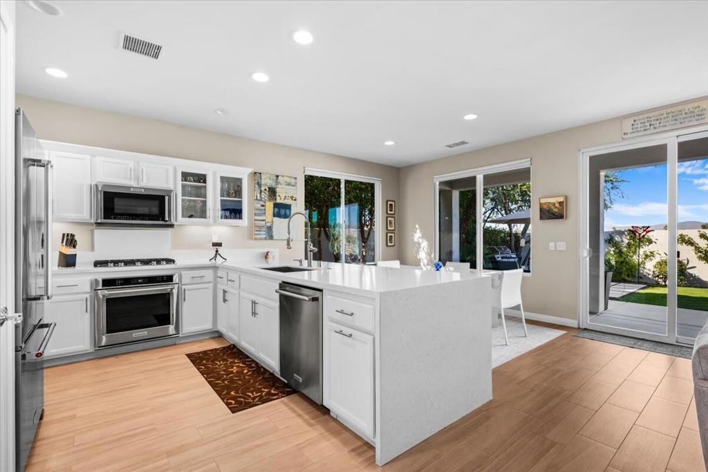 NOW SOLD TURNKEY FURNISHED! Discover the elegance of this remodeled Maurea floor plan including a casita in the prestigious 55+ La Quinta Trilogy golf course community. Featuring 3 bedrooms, 3 baths, this thoughtfully upgraded 1,641 sq. ft. home has it all! The kitchen boasts extended Italian quartz waterfall countertops, soft-close cabinetry, a cozy wine cooler nook and premium KitchenAid appliances. Two custom-designed pantries provide organized storage for all essentials. Relax in the inviting living room with remote-controlled window treatments, a mounted TV with soundbar and a horizontal electric fireplace. Dining area sliding door opens onto a professionally redesigned patio with mountain views, a commercial-grade misting system, paved entertainment space, fresh landscaping, upgraded irrigation and a painted privacy wall. Throughout the house, wood-look porcelain flooring adds warmth and sophistication. The primary bathroom shines with quartz countertops, contemporary fixtures, a remodeled shower and a spacious walk-in closet. A bright and welcoming guest bedroom invites natural light. The private courtyard casita includes an ensuite bath, redesigned desk nook, porcelain flooring and custom shutters. Natural light and mountain views complete this serene space. A mini-split AC, custom cabinetry and floor mats make the garage a practical and polished workspace. MOVE IN READY!! See it today!!