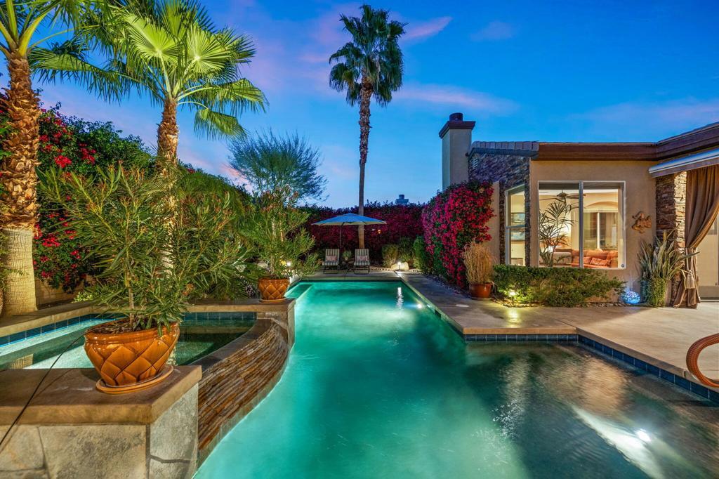 Welcome to your desert oasis in gated Lantana, where a grand double-door entry and atrium invite abundant natural light, highlighting 14-ft ceilings, earth tones, and travertine accent walls. Expansive slate floors create a gallery-like ambiance, with integrated lighting ideal for art display. In the living/dining area, remote-controlled brand-name blinds frame outdoor views, while a refinished fireplace adds a focal point. Step outside to one of the community's largest saltwater Pebble Tec pools and spa, with a soothing waterfall whose sound permeates the home. An electric awning and retractable sun screen help keep interiors cooler, as curated landscaping provides privacy. Enjoy the gourmet kitchen's granite counters and ample storage. The primary suite overlooks the pool and features an art niche, raised soaker tub, and walk-in shower. Upgrades include a new water heater, solar, electric car charger, and backyard misting system. Partially furnished, this 3BD/2.5BA layout wraps gracefully around the pool for seamless indoor-outdoor living. Near El Paseo's world-class shopping, fine dining, and Indian Wells, this prime desert locale continues to rise in appeal and value. Inside, it's a haven for artists and collectors--a rare work of art to add to your collection. View today!