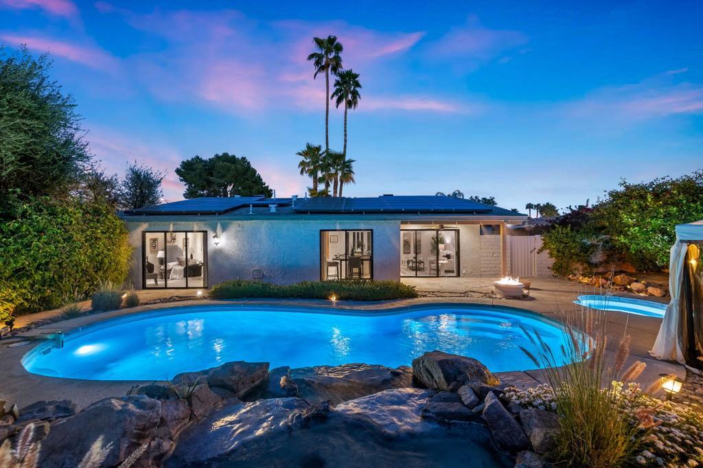 Welcome to 43205 Silk Tree Lane, your desert oasis in Palm Desert! Built in 1979, this single-level 3-bed/2-bath corner-lot home (1,288 sq ft) spans nearly a quarter acre with no HOA dues. Rich stone and rockwork complement low-maintenance landscaping for the ultimate indoor-outdoor lifestyle--from lively poolside BBQs to stargazing around the cozy firepit. A private saltwater pool/spa awaits, complete with a refreshing misting system. 14.4 kW Lease/PPA Solar panels, attic fans, and automated lighting enhance year-round efficiency. Inside, a sun-soaked open-concept layout flows effortlessly outdoors, capturing cool breezes and nice natural light. Enjoy tiled floors, recessed lighting, granite slab counters, and a built-in wine fridge--perfect for entertaining. The step-free design offers safety and convenience, enhanced by direct garage access and an updated washer/dryer. The large lot also offers room for expansion. Ideally located near El Paseo's world-class shopping and dining, Civic Center Park & Aquatic Center, and top-rated schools including College of the Desert and Palm Desert High, with residents qualifying for discounted golf at Desert Willow Golf Resort. Embrace the perfect blend of comfort and convenience--don't miss your chance to own this prime desert retreat today!