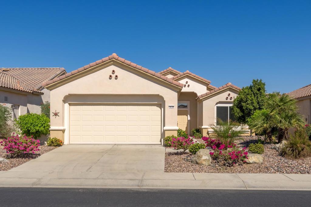 Sun City Palm Desert - Lanai. Located in the center of the community, this home has a spacious north facing rear yard with an extended patio with an alumawood patio cover and low maintenance desert landscaping. AC new in 2017. Inside, vinyl plank and carpeting are used extensively. The living room has a built-in media center. The kitchen features tile counters and a skylight. Oak cabinetry is in the kitchen and bathroom. The primary suite has a walk-in closet with built-in storage. Its bathroom has a stall shower with rain-glass doors and a sitting vanity. A tub/shower is in the guest bathroom with textured glass doors. The extended 2 car garage has its own AC, a utility sink and built-in storage.