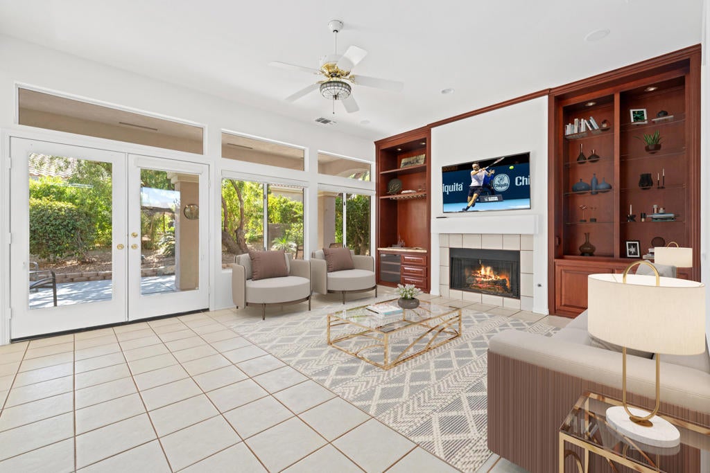 Sun City Palm Desert - Marquis. Ideally located, around the corner from the Mountain View Clubhouse (indoor & outdoor pools, fitness center, driving range, restaurant, hobby rooms, etc.), this estate model home has a spacious south facing rear yard with an extended patio surrounded by lush desert landscaping. Decorative concrete, a gated front courtyard and double door entry provide curb appeal. Leased solar provides below market electricity. The monthly average for electric when the home was last occupied year round was $223. Upon entry, 12ft coffered ceilings are in the greatroom and foyer (w/uplighting). 10ft ceilings are elsewhere. The interior is freshly painted. A gas fireplace and built-in media center are in the family room. The kitchen features extensive raised panel maple cabinetry, slab granite counters with bullnose edge, and a smooth glass electric cooktop (also plumbed for gas). A den/office with hardwood flooring is off the main hallway. A tower skylight precedes the double door entry to the primary suite that features a bay window, coffered ceiling and huge walk-in closet. The primary suite bathroom also has a coffered ceiling, dual sinks, a stall shower, oversized tub and tile surfaces. The spacious guest suite has a shower/tub in its bathroom. The laundry room has lots of built-in cabinetry and a utility sink. The 2+ golf cart garage has room for ample storage. Dual AC is new 2018 and 2010.