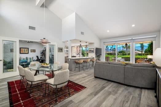 Views! Views! Views! Welcome to Monterey Country Club! Located on a prime South facing parcel & boasting awesome fairway & surrounding panoramic mountain vistas, this spacious 2 bedroom + den/office, 2 bath home can be your desert dream come true! The extensive remodeling & updating was completed in 2022. The wall was removed between the living room, dining area & kitchen creating an expansive great room featuring a high vaulted & beamed ceiling & fabulous golf course & mountain views. The new custom designed kitchen highlights a breakfast/eating bar. .The atrium was enclosed to create a den/office with a ceiling fan & 2 skylights added for natural light & one skylight opens for fresh air.. The primary bedroom suite includes 2 wardrobes & a luxurious new bathroom with a stall shower. The guest bedroom looks into the front gated courtyard & utilizes the updated hall bath with a tub/shower. Features include: all new wood-look ceramic tile flooring throughout; new baseboards; new light fixtures & canned lighting; fresh paint; new custom kitchen cabinetry, quartz countertops & breakfast/eating bar; new stainless farmhouse sink, refrigerator & range; new windows & sliding doors on the South side of the home; new window coverings; 2 sets of French doors in the home; new closet wardrobe doors; new toilets & bath vanities in both baths; new shower stall in the primary bath; an inside laundry area in the hall closet; a new water heater & an attached 2-car garage with a garage opener & a door leading into the gated front courtyard. Relax & enjoy the serene views from the patio area with sun & 2 electric awnings for shade. Brand new Sunsetter awing coverings to be installed in mid March 2025. A quiet cul-de-sac street & close proximity to the clubhouse, gym & tennis courts is a bonus. Monterey Country Club boasts 27 holes of golf; tennis courts; pickleball courts; bocce ball; fitness center; Clubhouse with restaurants & bar area; many social activities; 37 community pools & spas & a guard gated access. Note: some club ammenities such as golf, tennis & fitness memberships are at an additional cost.