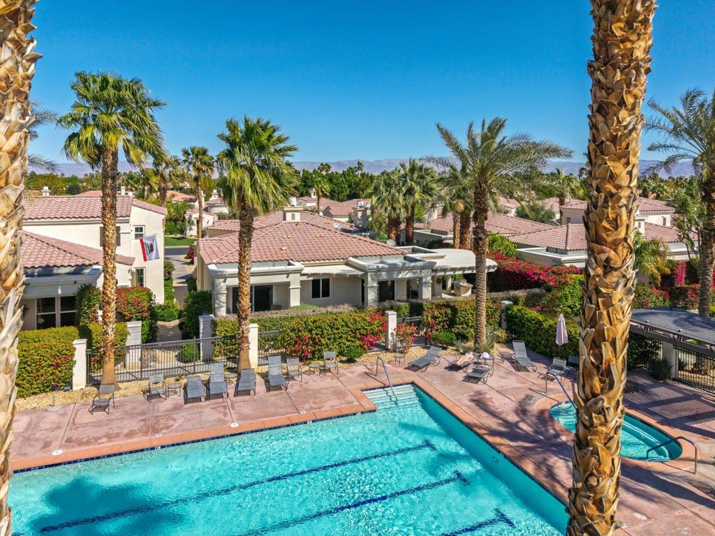 Sunny South Facing Hacienda with Unobstructed Views & Plenty of Privacy in Charming Puerta Azul. This premium location features sunlight throughout the day and easy access to the nearby community pool. Light, bright and pristine clean this desert retreat (2BR/2.5BA | 1,557 Sq. Ft.) features 2 primary suites with dual vanities located at opposite ends of the home, providing great privacy for visiting family and friends. Timeless saltillo flooring throughout with rich dark wood cabinetry, rustic plantation shutters and art deco tile accents creates a warm and cozy atmosphere reminiscent of the world famous La Quinta Resort. The fully equipped kitchen offers bar seating, stainless steel appliances, granite slab countertops and a great view from the kitchen sink! Spacious dining area with dual sliding glass doors creates a seamless transition between indoor and outdoor living. The spacious wrap-around patio with extended allumawood pergola and cafe lighting allows you to seek the sun or relax in the shade while taking in the scents of blooming flowers and citrus blossoms. Whether you're looking to dip your toe in the water of desert ownership or doing a 1031 exchange, this unique property checks all the boxes!