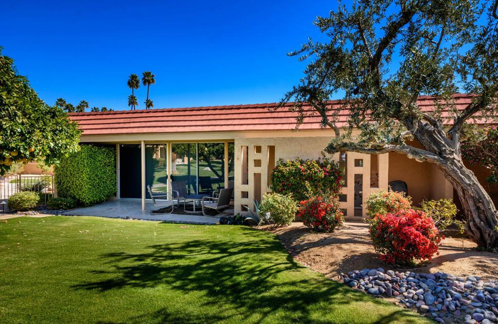 Located in Indian Wells Country Club, this 3 bedroom, 3 bath classic mid-century designed condo is a popular floor plan. With large sliding glass doors that open to the patio with spectacular mountain views and also to the center courtyard, there's light and views in every direction. No other condos look into this unit and there's ample room between the unit and the large community pool and spa. The grounds are meticulously landscaped and managed by the HOA. Citrus trees, manicured lawns, flower beds and lots of palm trees create the perfect desert oasis and a large patio to enjoy it all. Kitchen offers Granite counter tops, custom cabinetry and bar counter. Tile floors, carpet in bedrooms.Each bedroom opens to a patio or courtyard. High ceilings and extra-large sliding glass doors and windows. 2-car detached garage is the closest garage to the unit, only a few steps away from the front door. Great value, location, view and floorplan. No road noise.